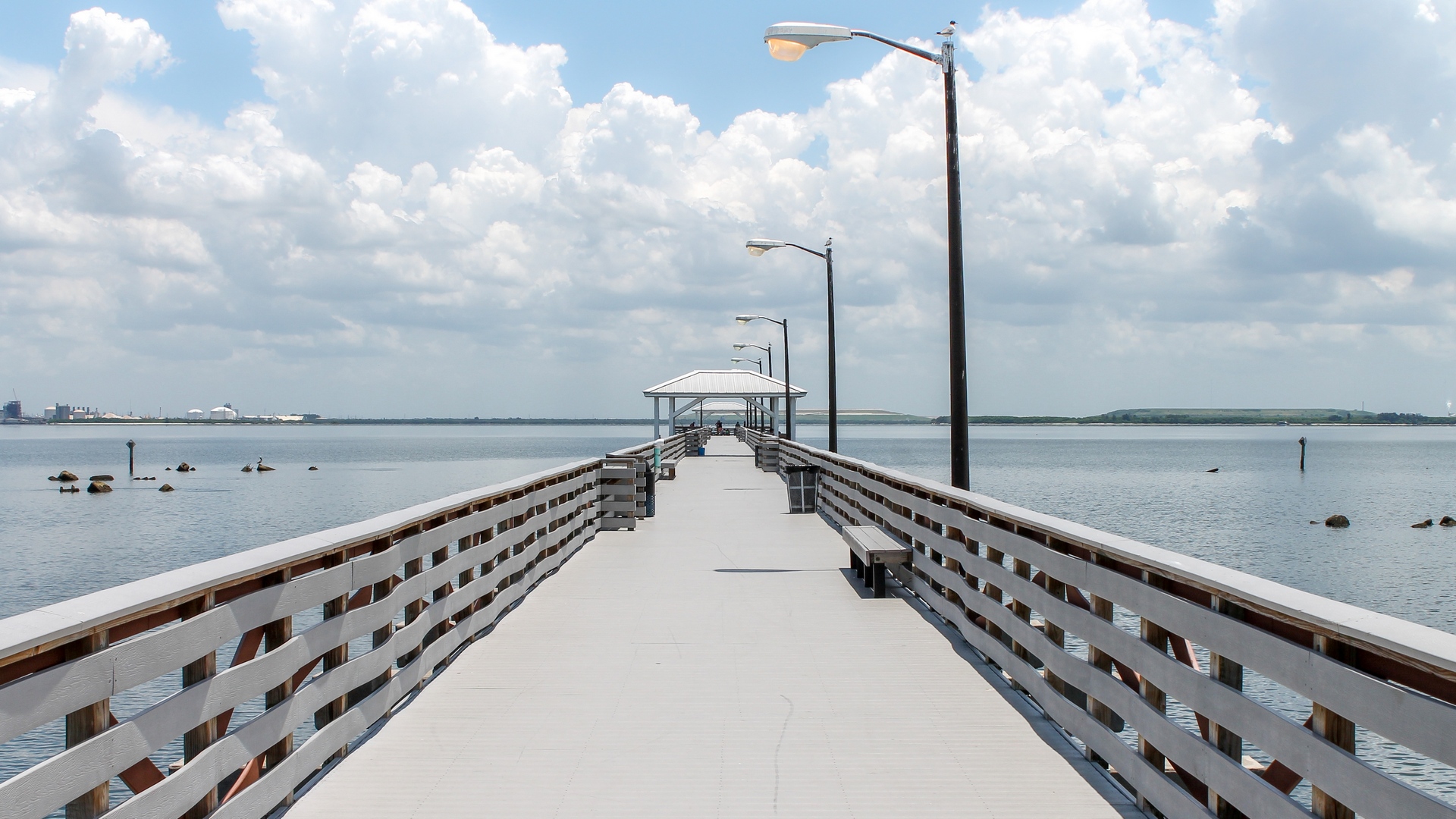 Description: A long pier with a light pole and a light pole on the end of it and a light pole on the other side of the pier.