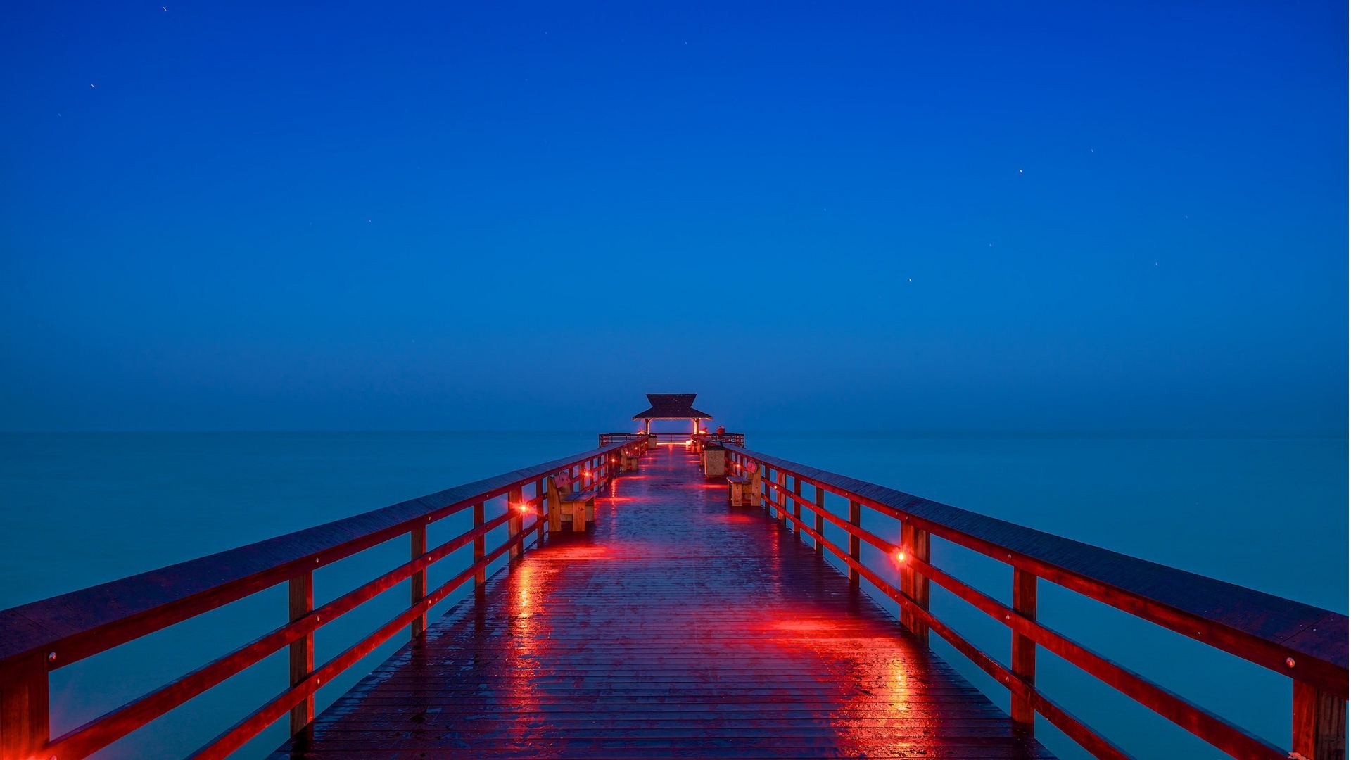 Description: A pier with lights on it at night time with a blue sky in the background and a red light on the end of the pier.