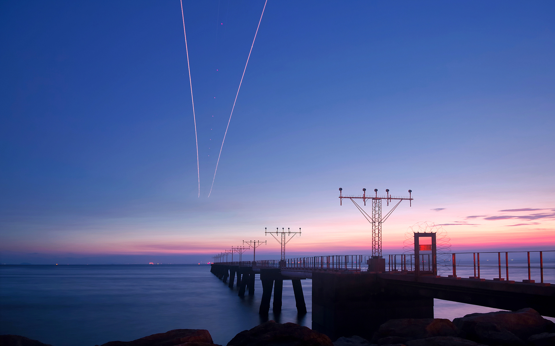 Description: A long pier with a plane flying over it at sunset with contrails in the sky above it and a body of water below.