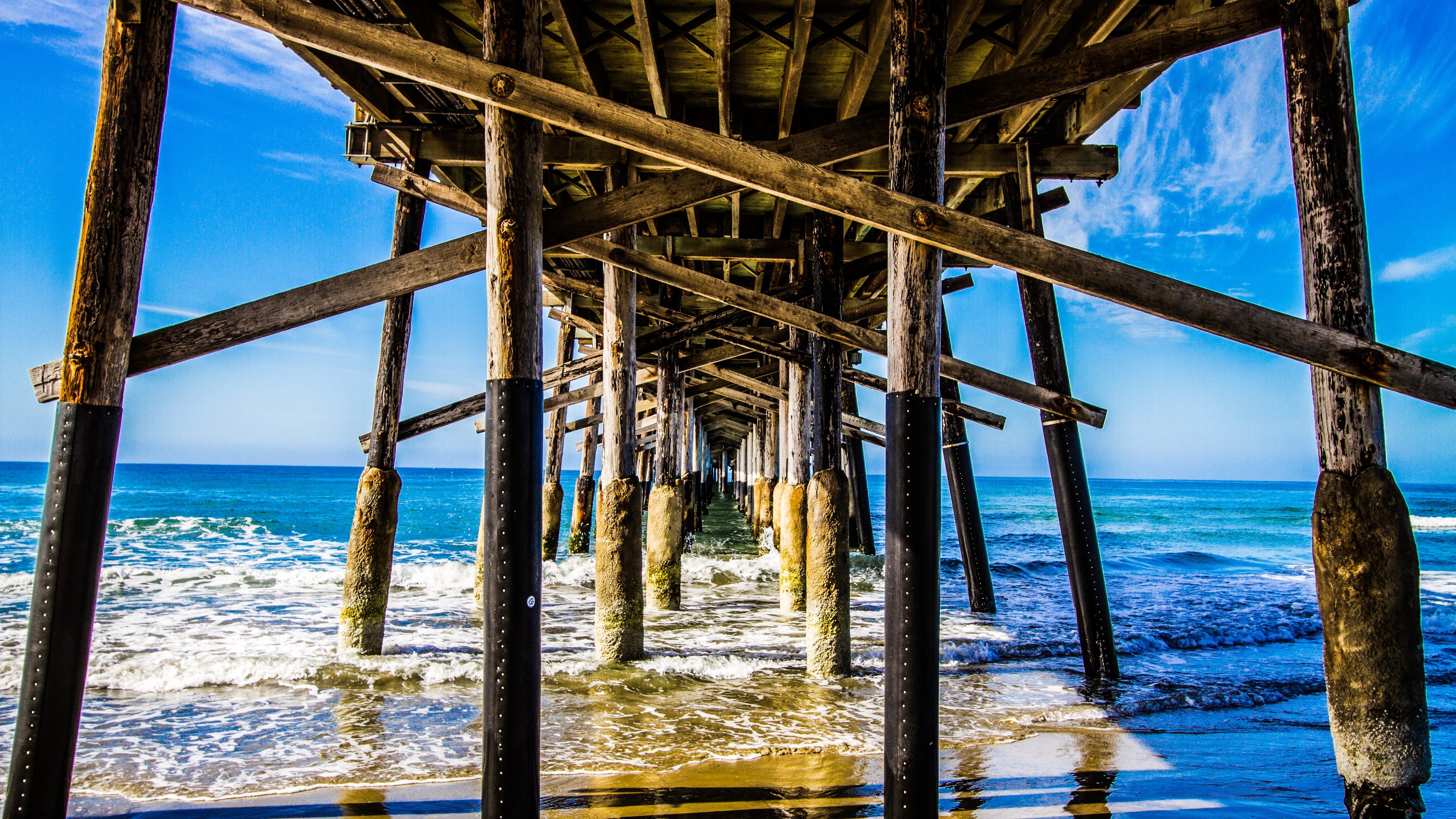 Description: A pier with water underneath it and a sky background with clouds above it and a blue sky above it.