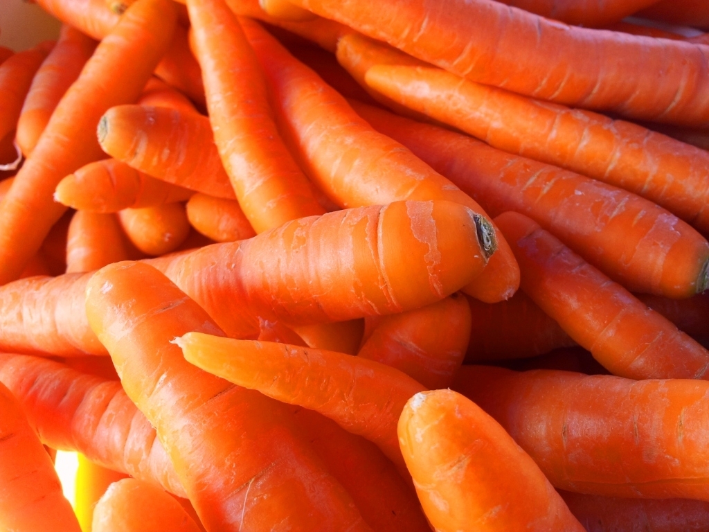 Description: A pile of carrots sitting next to each other on a table top with a white bowl of carrots.