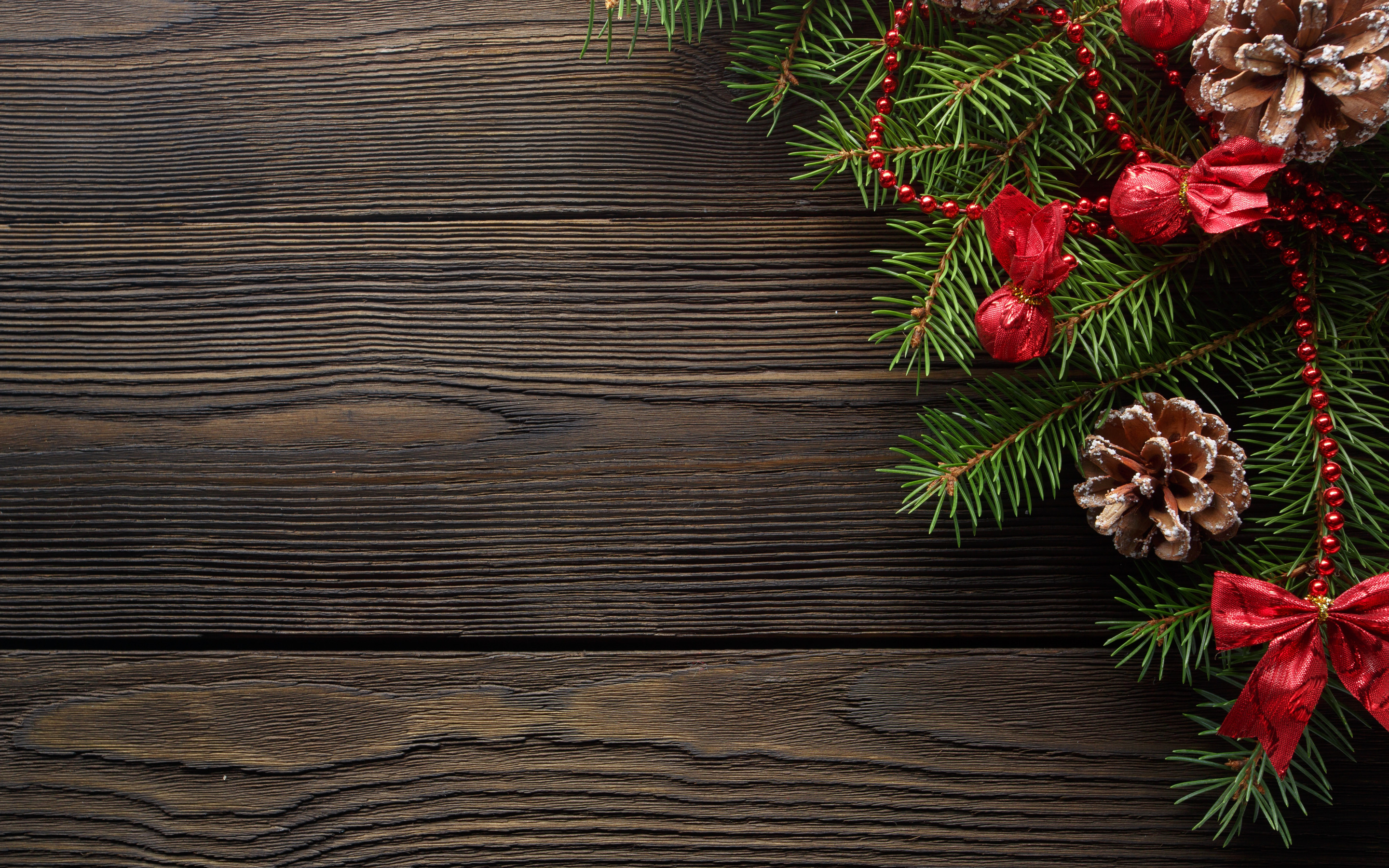 Description: A pine cone and red ribbon on a wooden table with pine cones and cones on it.