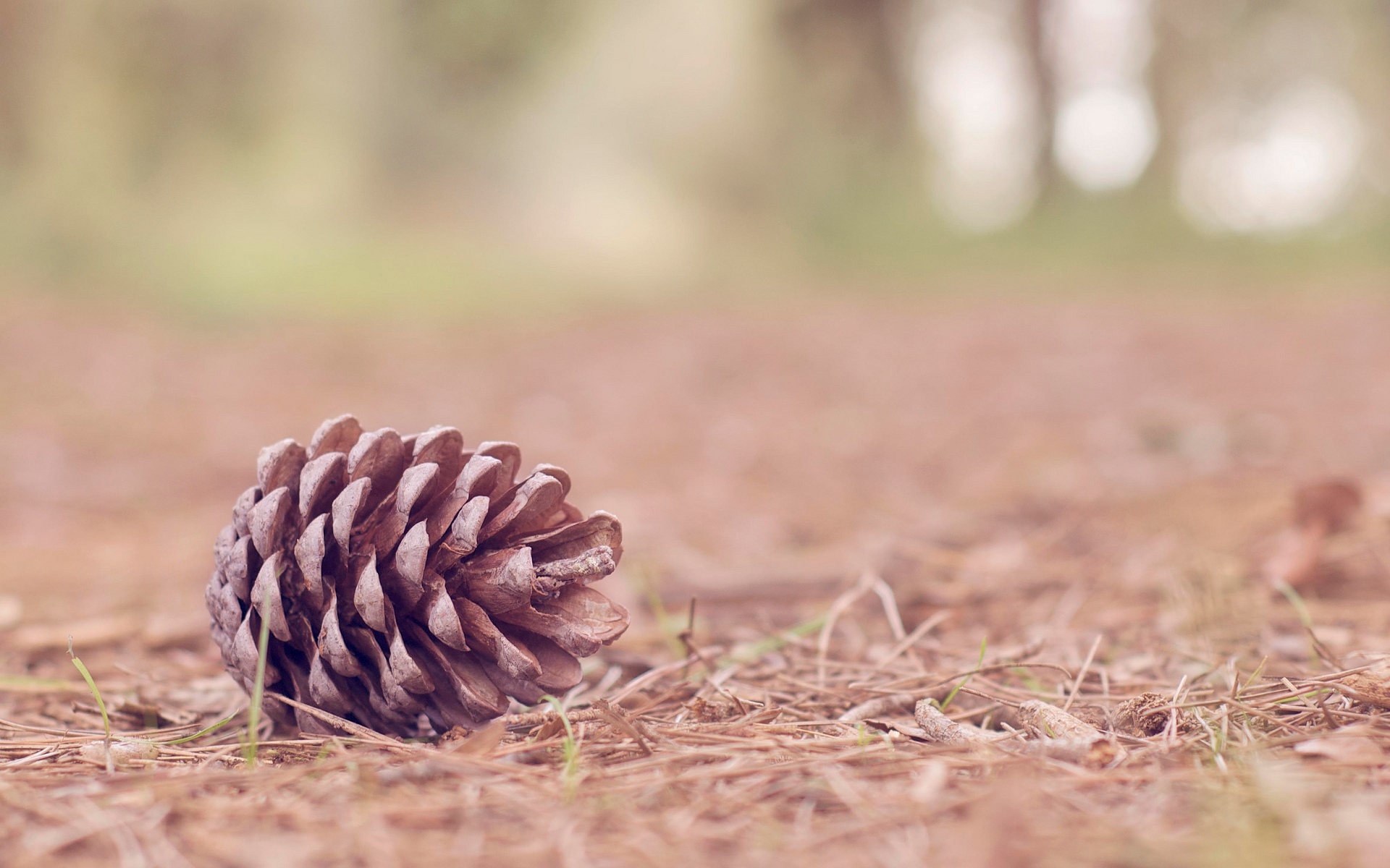 Description: A pine cone sitting on the ground in the woods with grass and trees in the background.