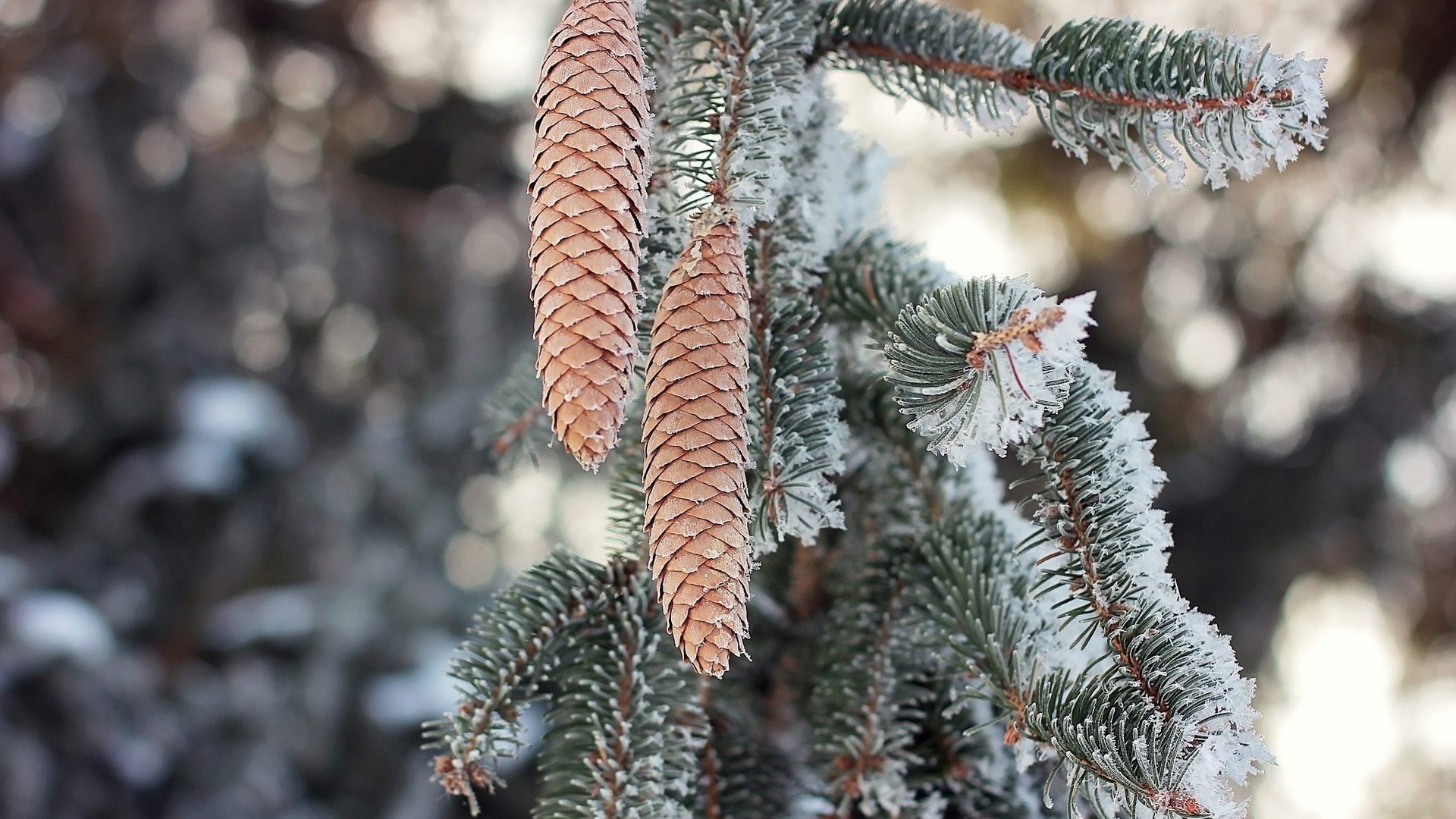 Description: A close up of a pine tree with snow on it's needles and needles on it's branches.