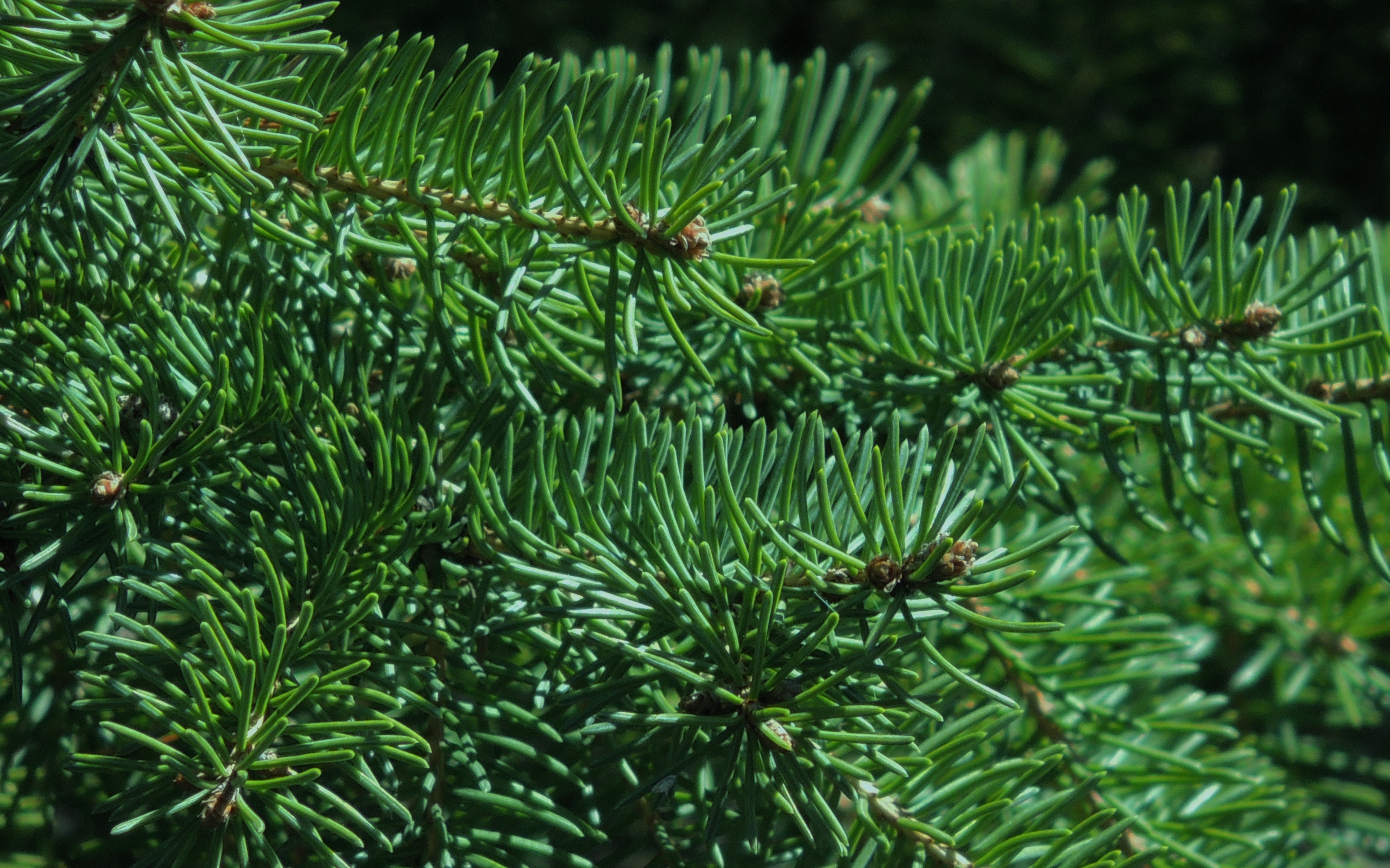 Description: A close up of a pine tree with lots of needles on it's branches and leaves on the branches.