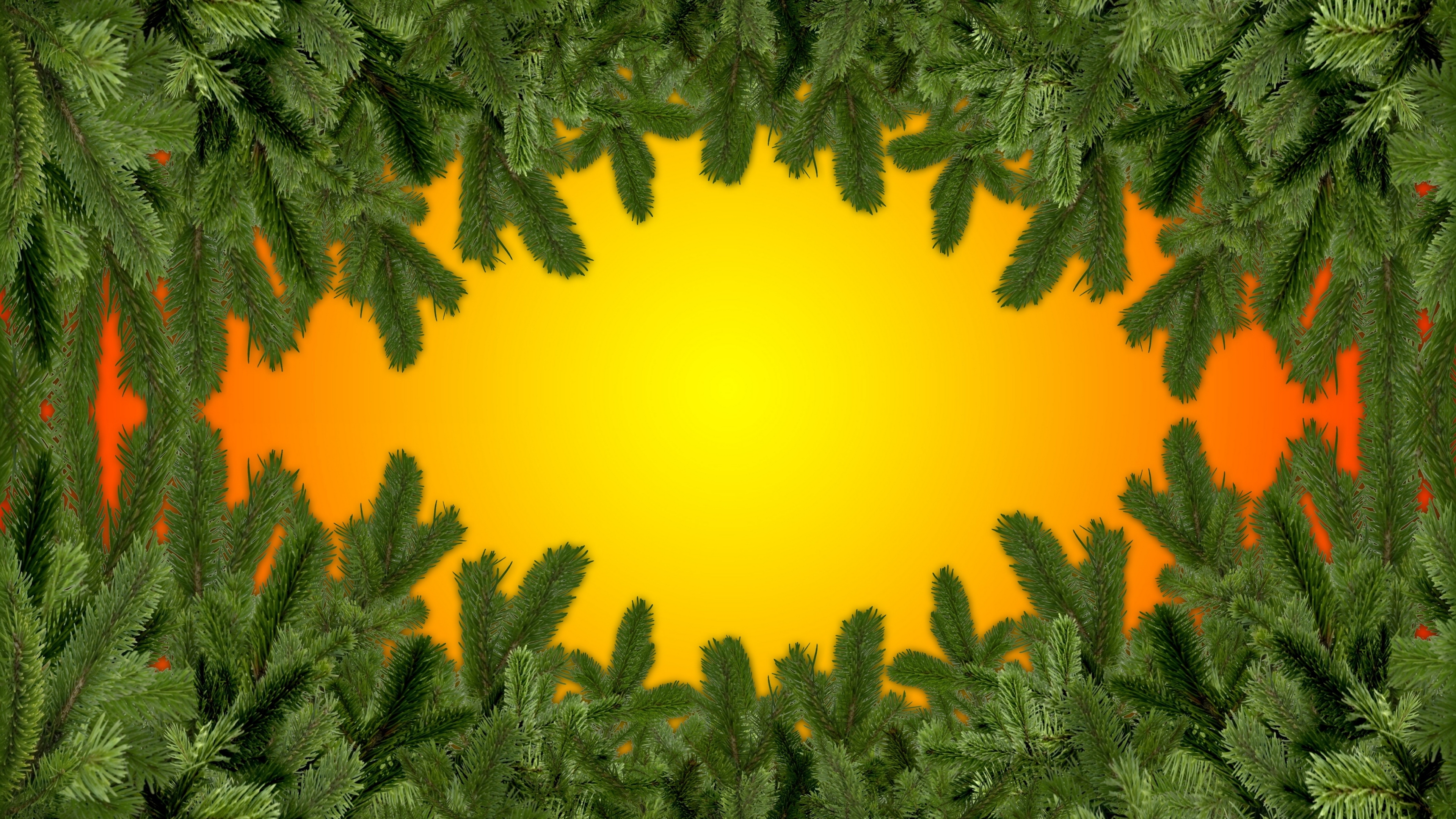 Description: A picture of a pine tree with a yellow background and a yellow center surrounded by green leaves and branches.