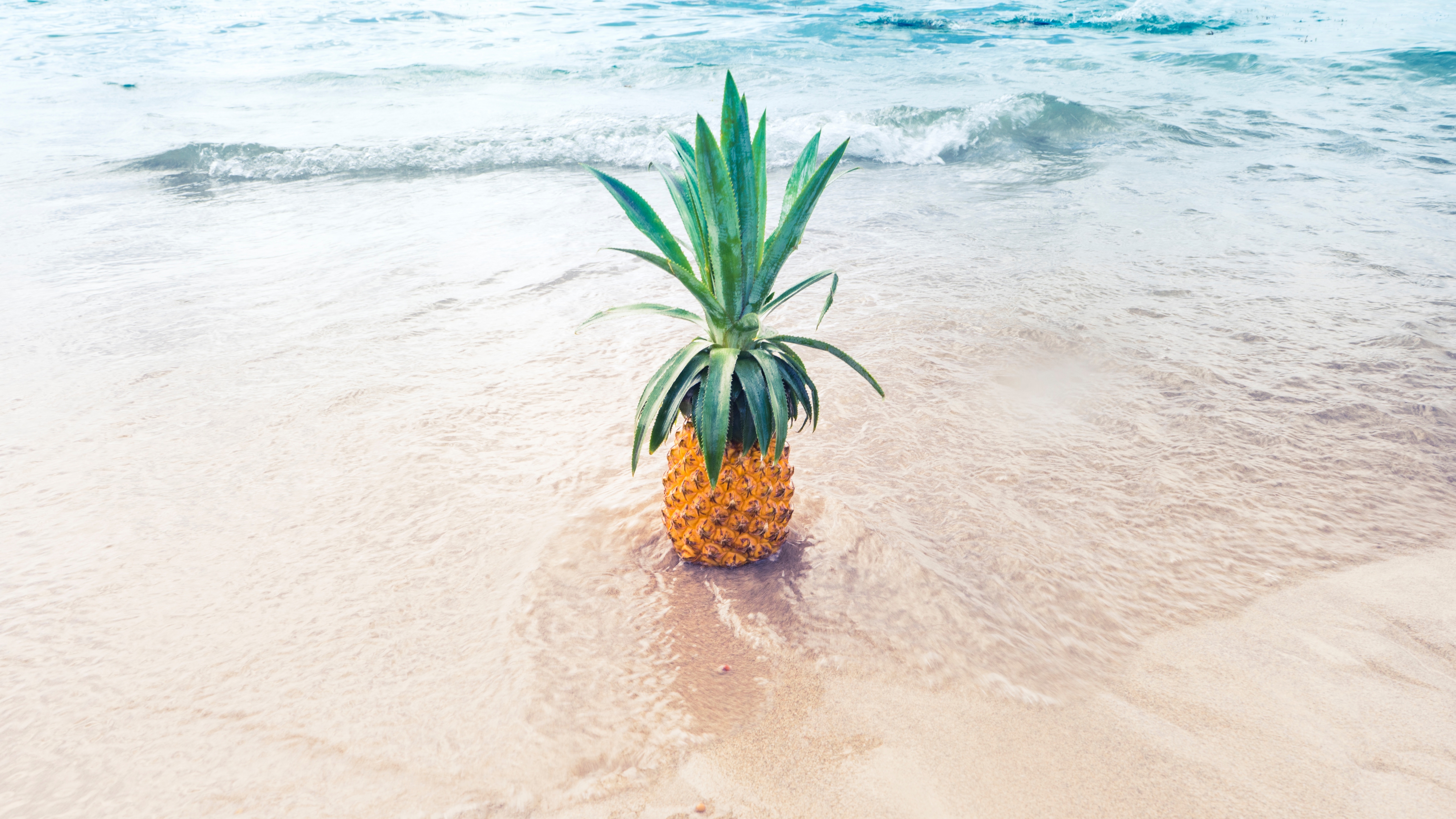 Description: A pineapple sitting on top of a sandy beach next to the ocean with waves coming in and out of the water.