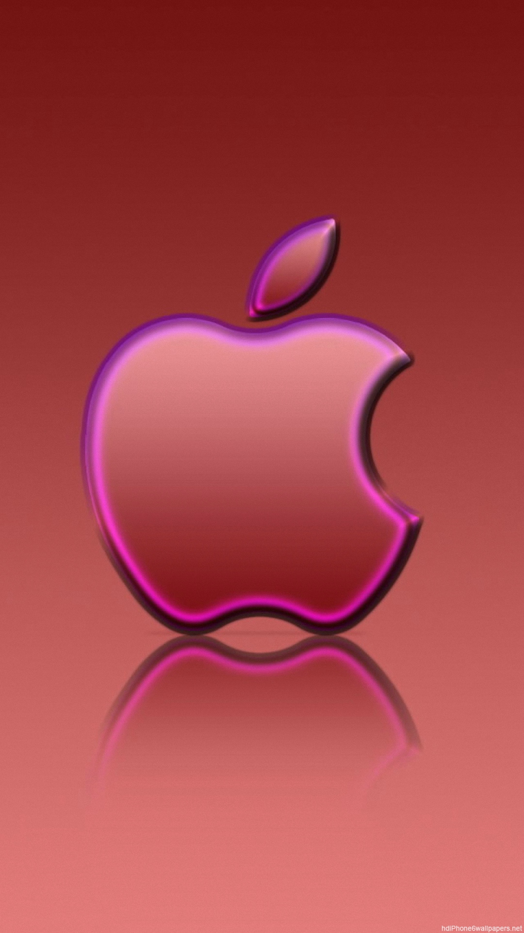 Description: A pink apple logo on a red background with a reflection of the apple logo on the bottom of the image.