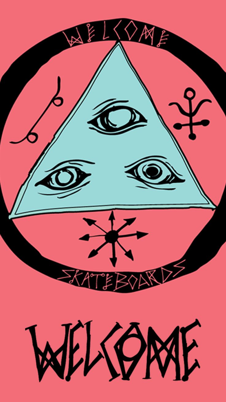 Description: A pink background with a triangle and eye on it with the words welcome to the state of texas written below.