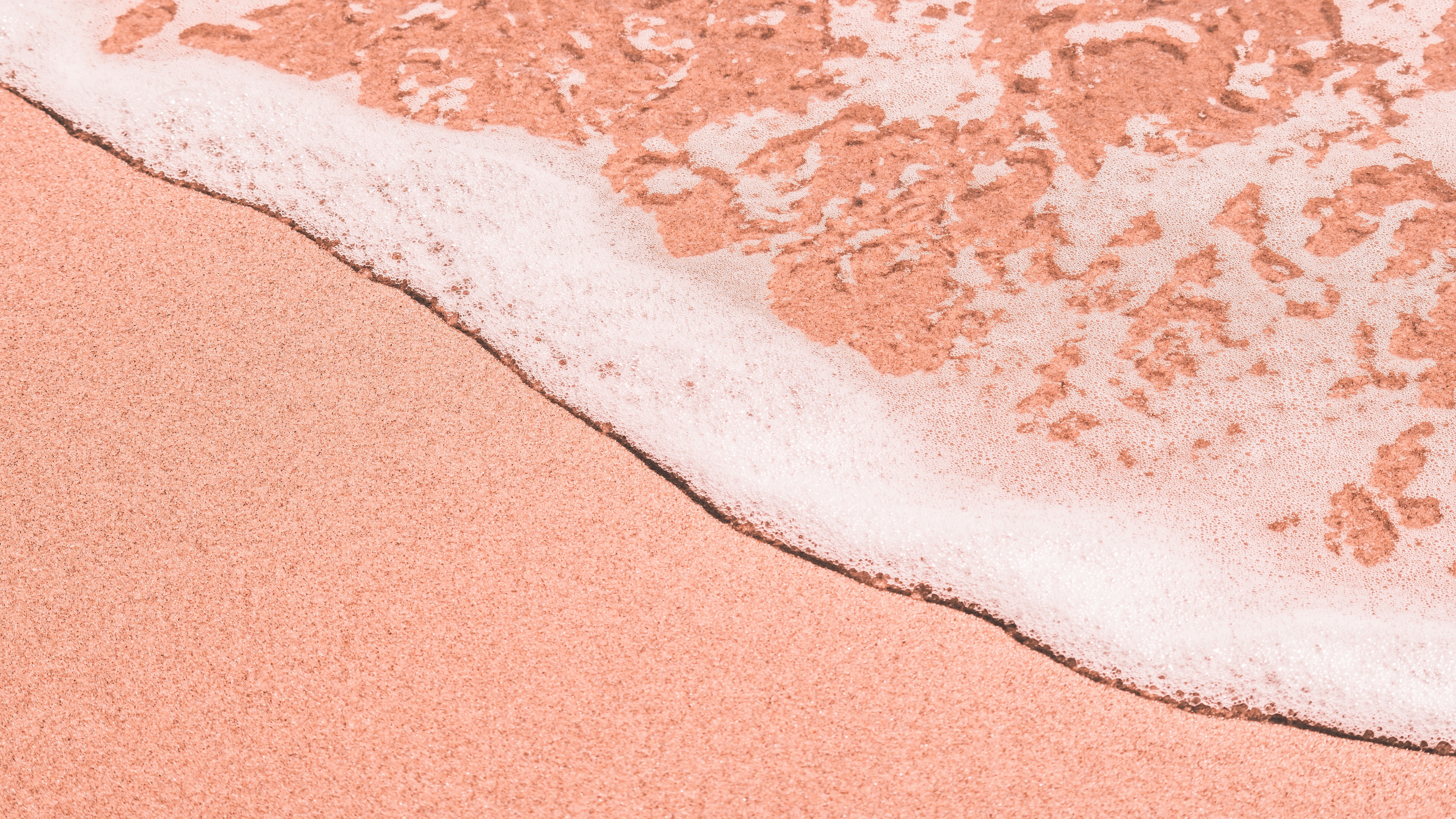 Description: A wave rolls in on the sand of a beach with a pink sand and white foam on it and a pink sand and white foamy wave.