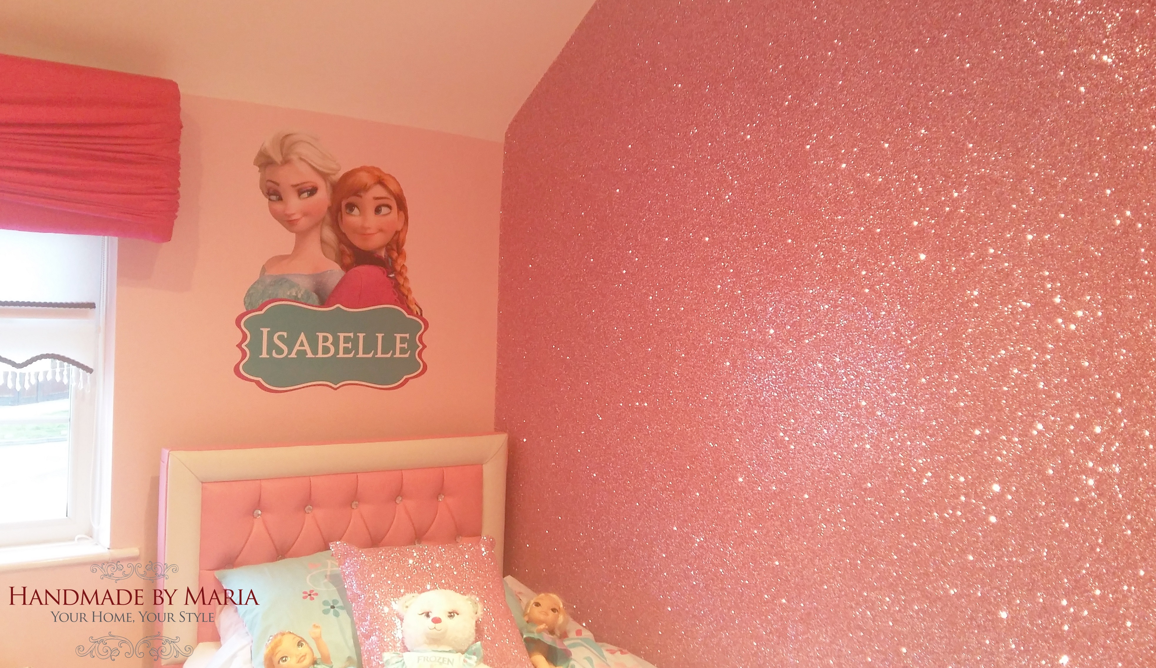 Description: A bedroom with a pink wall and a pink bed with a pink headboard and a pink wall with a picture of a princess.