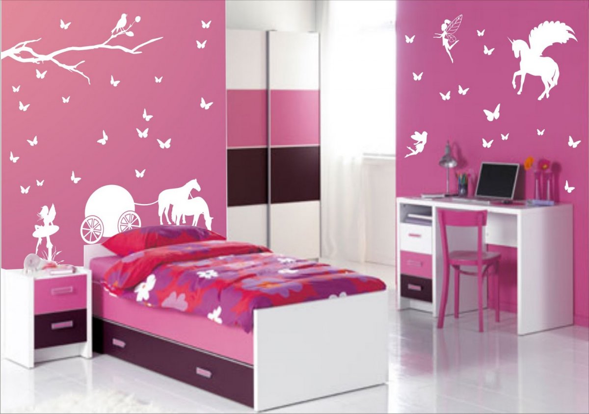 Description: A bedroom with a pink wall and white furniture and a pink bed with a pink comforter and a white desk with a laptop.