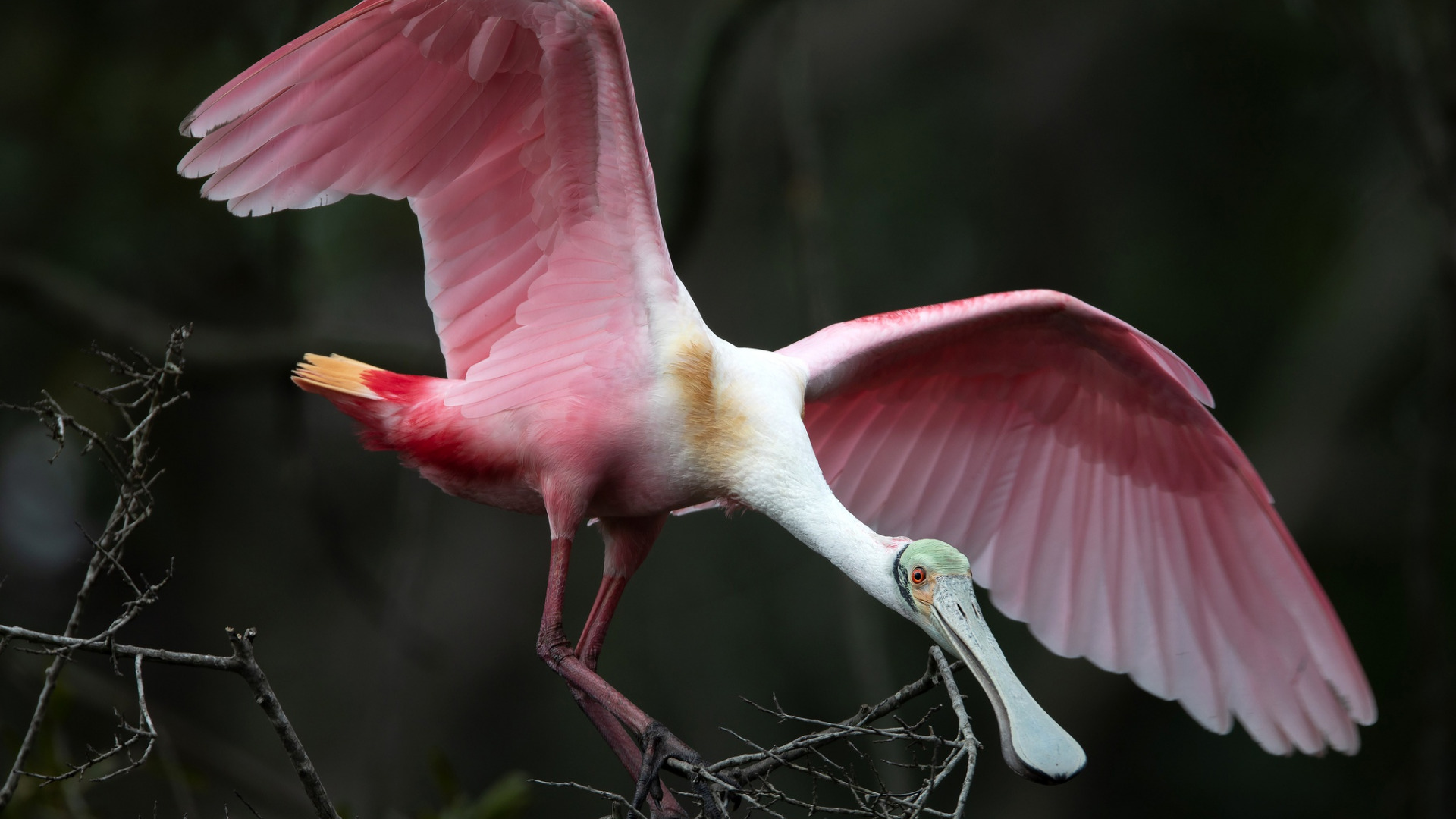 Description: A pink bird with a long beak is flying over a tree branch with its wings spread out and it's head is in the air.
