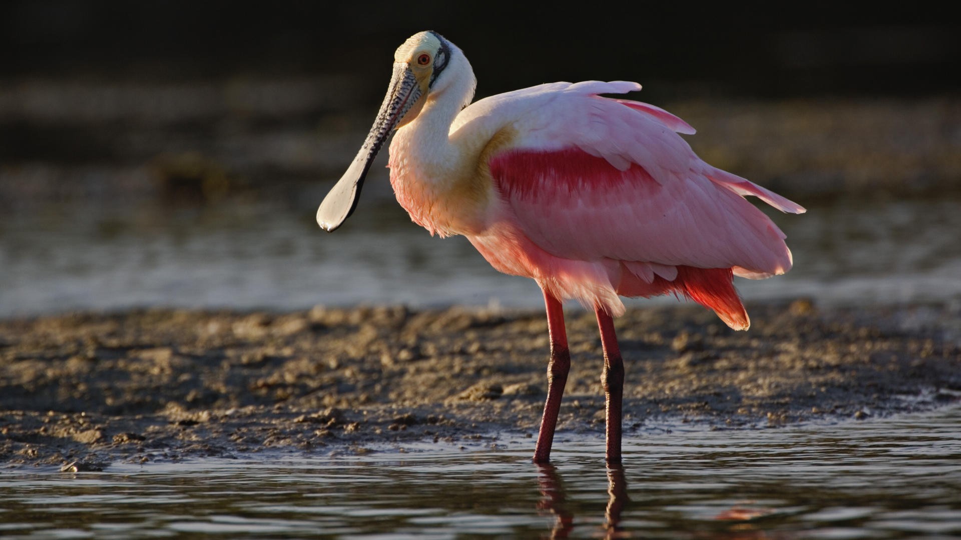 Description: A pink bird with a long beak standing in the water with its beak in its mouth and it's long legs in the water.
