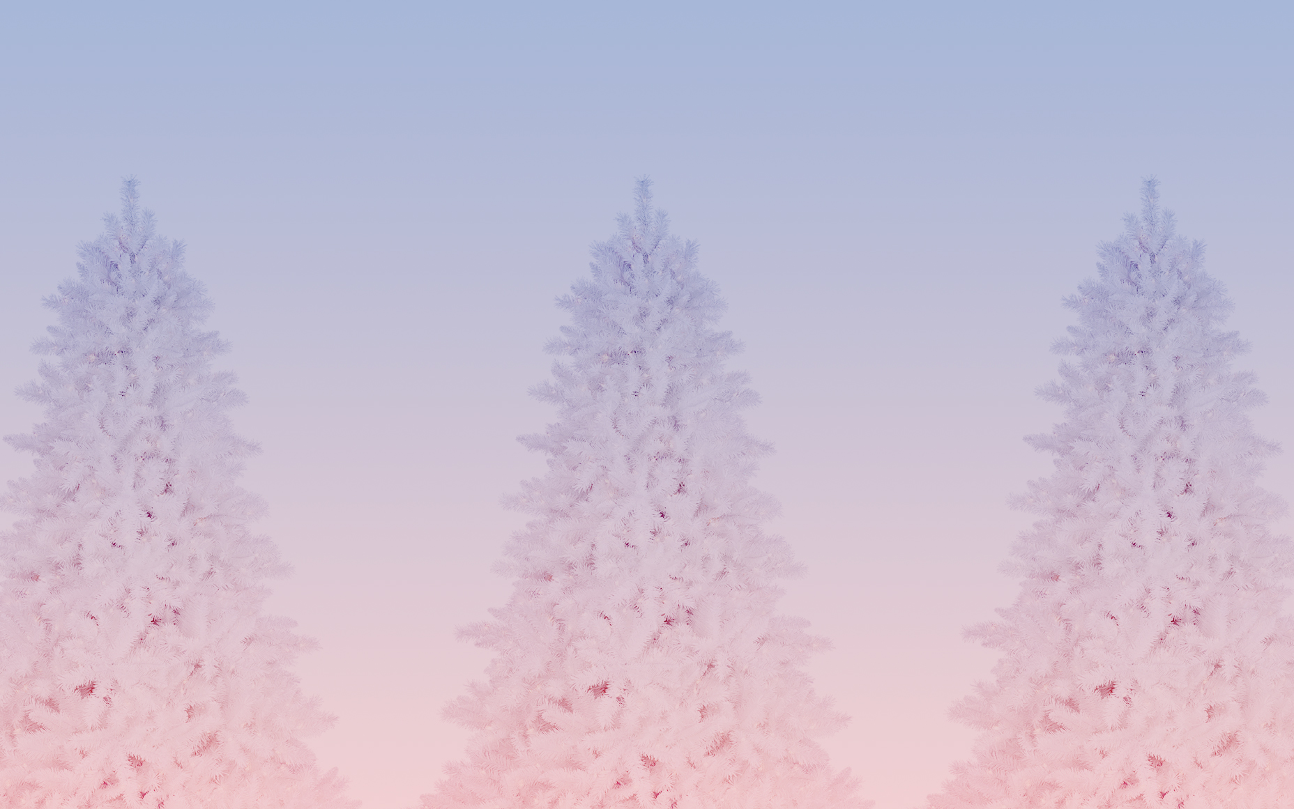 Description: A pink and blue background with three trees in the foreground and a blue sky in the background with a few clouds.