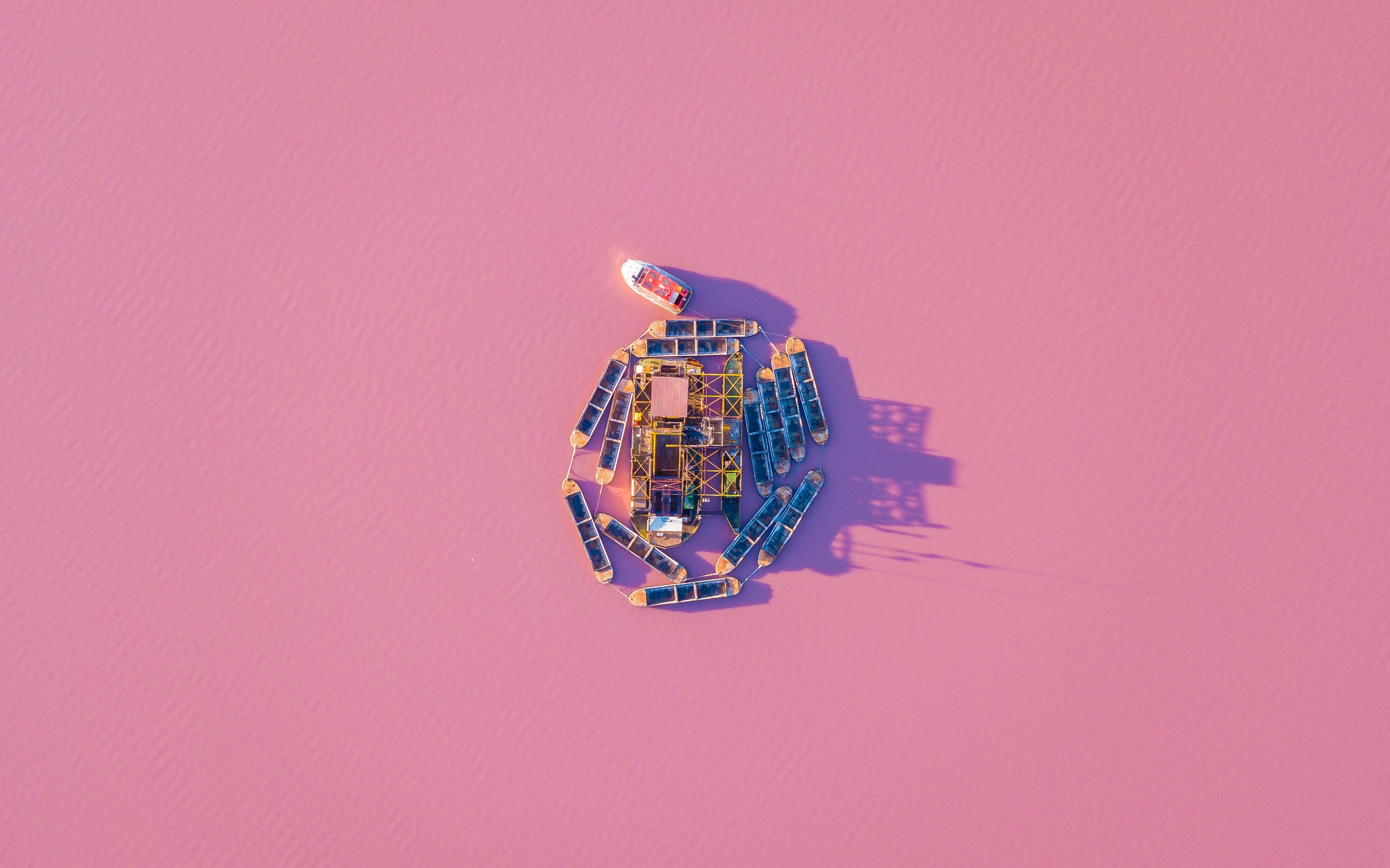 Description: A pink background with a small boat in the middle of it and a pink wall behind it and a pink floor.