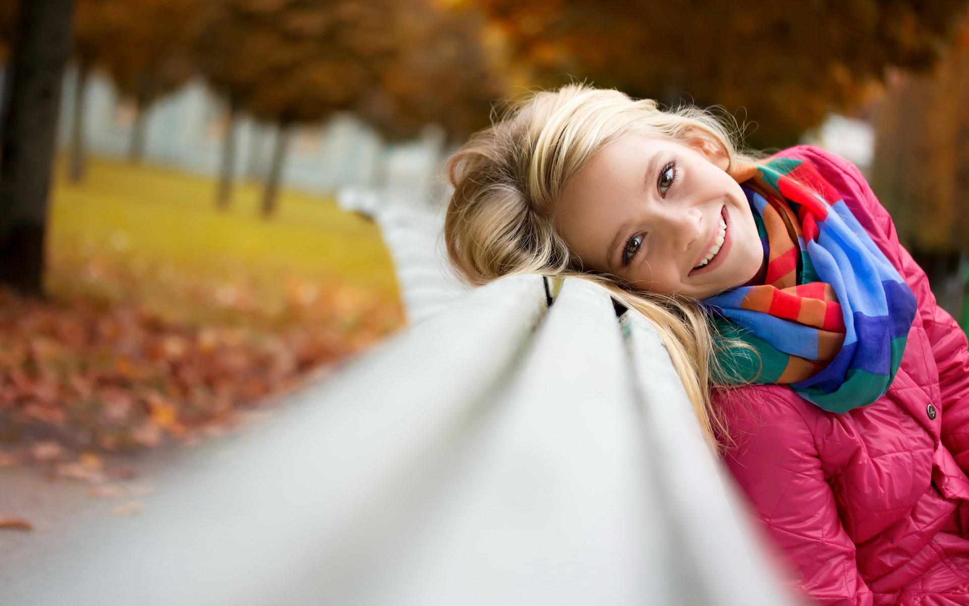 Description: A woman in a pink coat leaning on a white bench in a park with trees in the background and leaves on the ground.