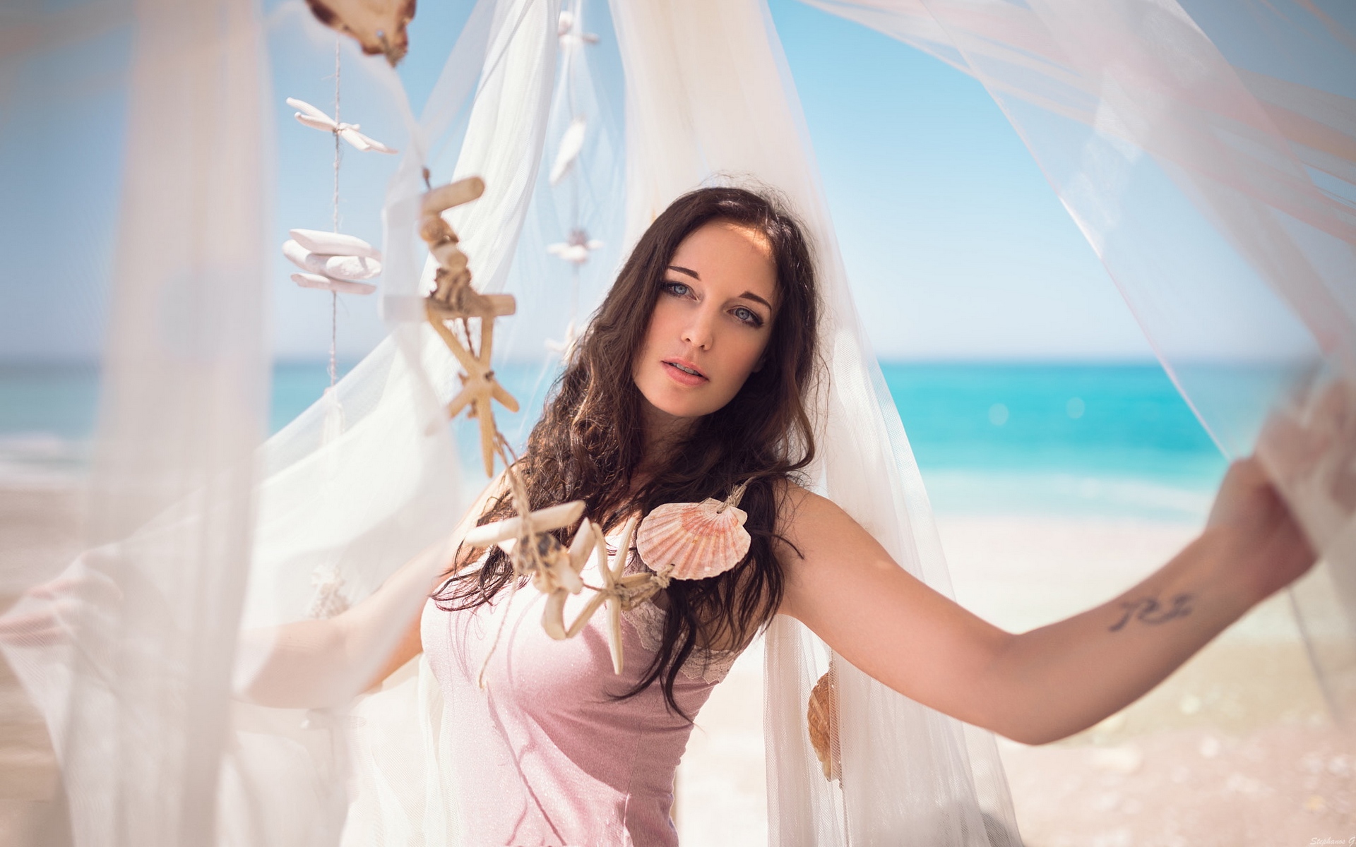 Description: A woman in a pink dress holding a white veil over her head and a shell on the beach with a starfish on it.