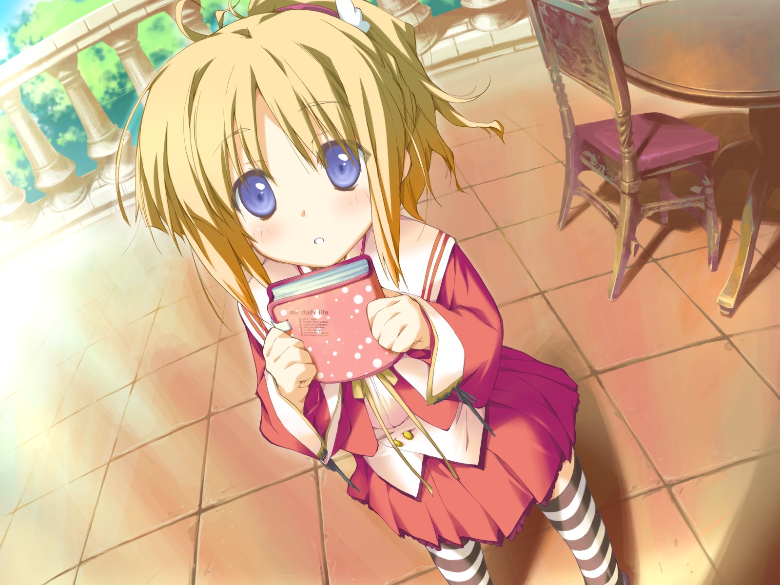 Description: A girl in a pink dress holding a cup of coffee in her hands and looking at her phone in a room with a table and chairs.