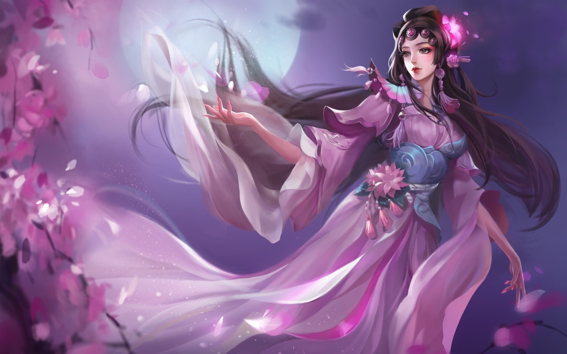 Description: A woman in a pink dress holding a white object in her hand and a purple background with flowers on it.