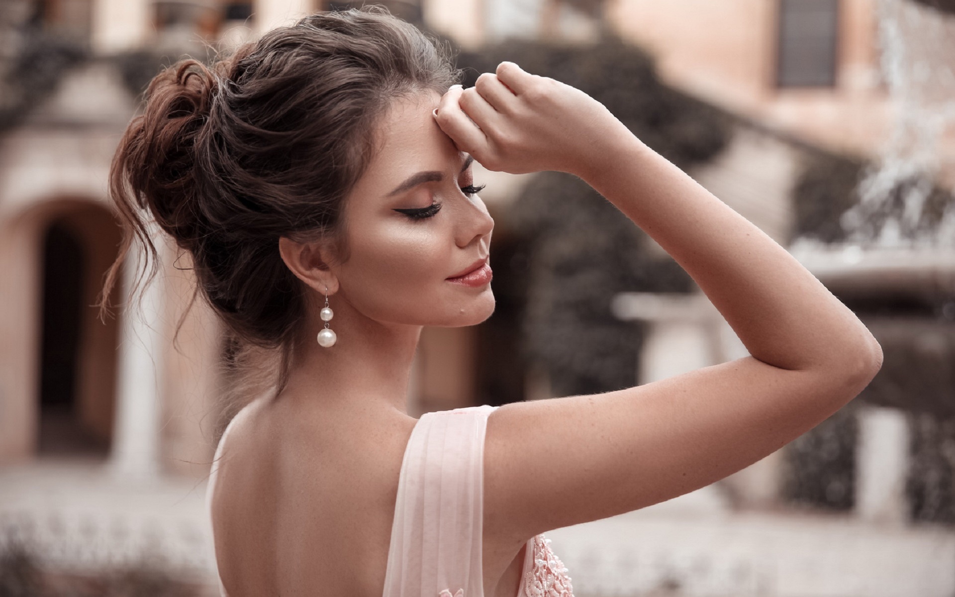 Description: A woman in a pink dress is holding her hair in her hand and looking off to the side with a fountain in the background.