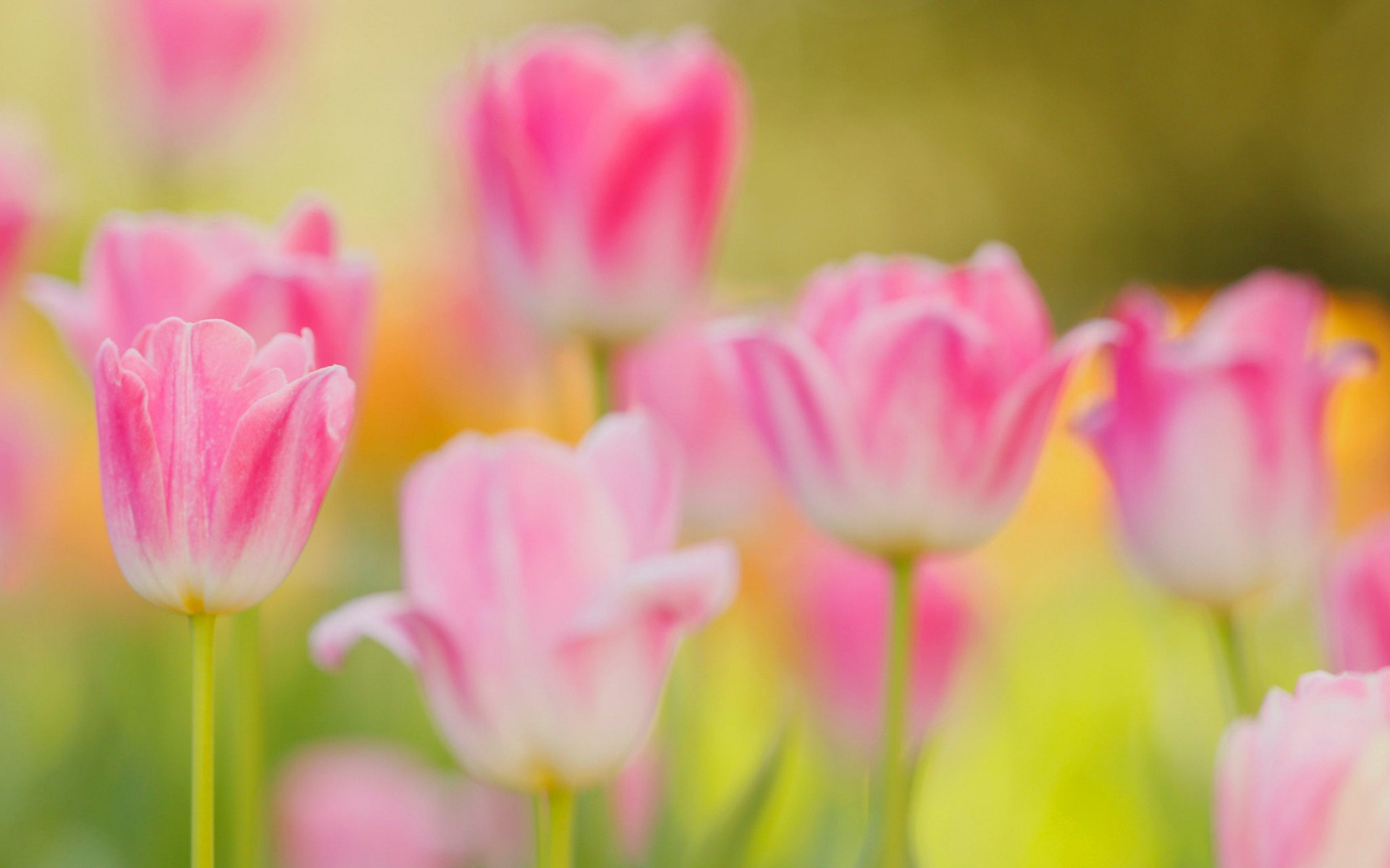 Description: A field of pink and white flowers with a blurry background of yellow and pink flowers in the background.