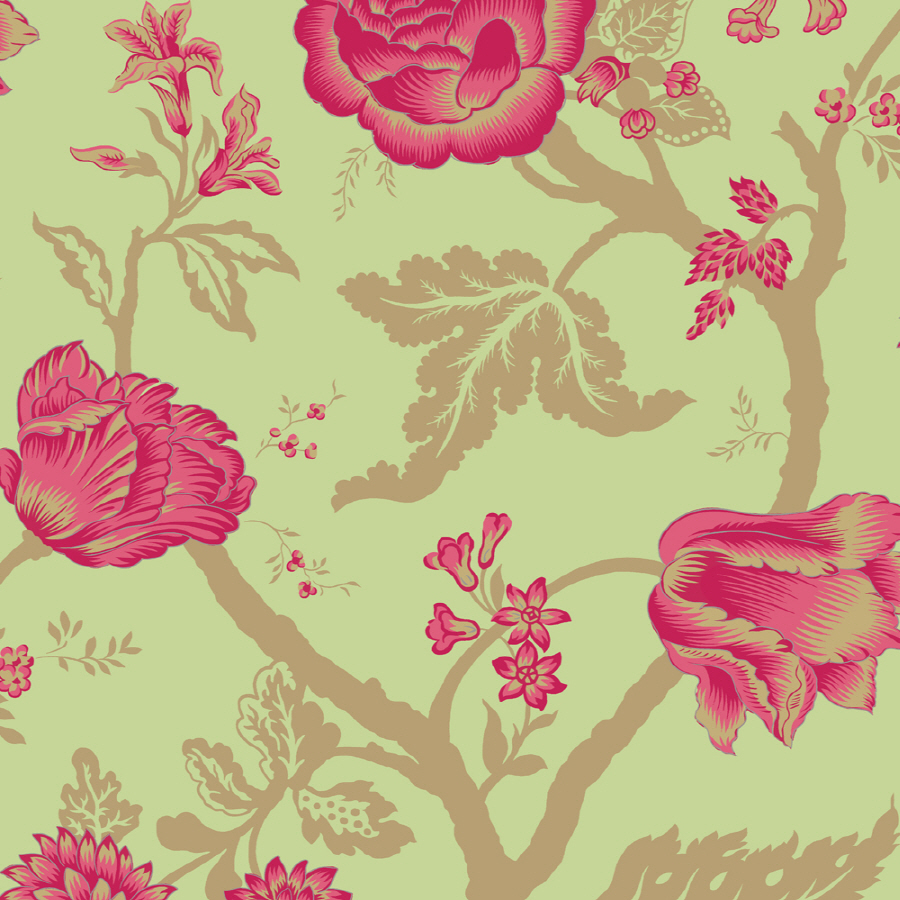 Description: A pink flower on a green background with leaves and flowers on it.