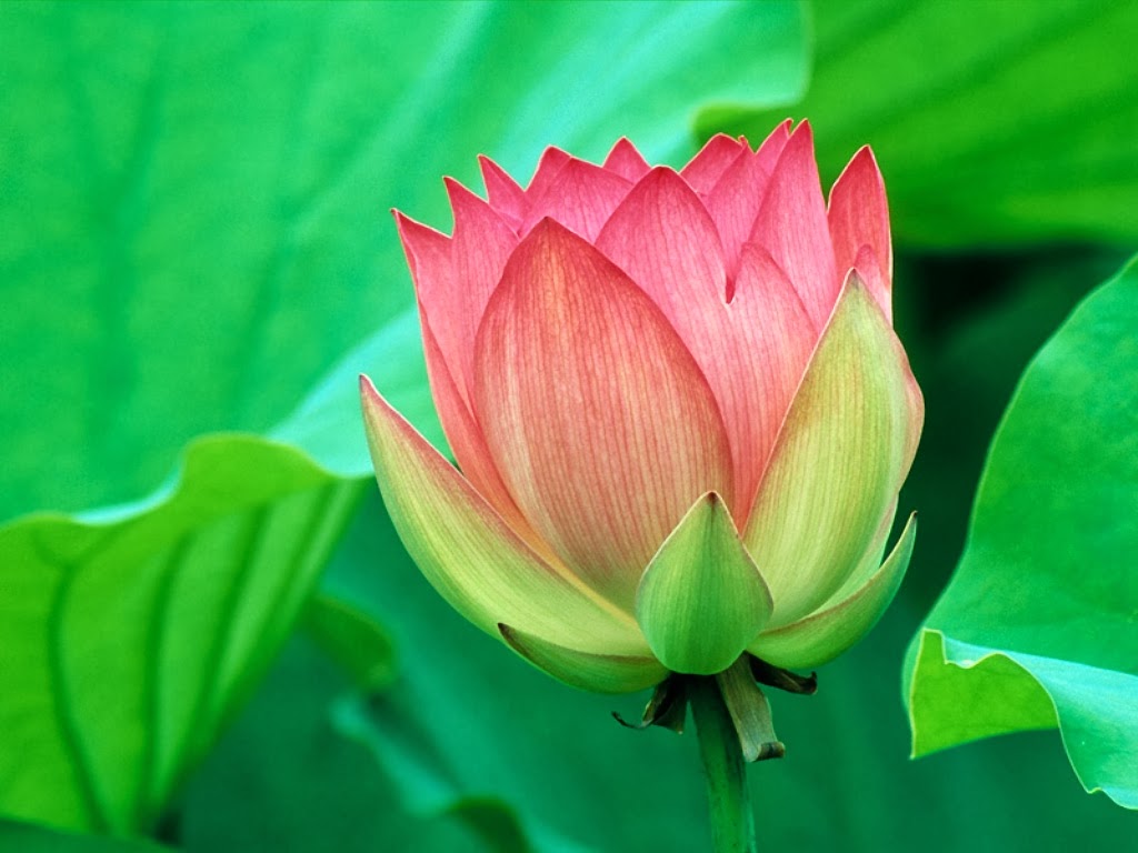 Description: A pink flower with green leaves in the background and a blurry background of leaves in the foreground.