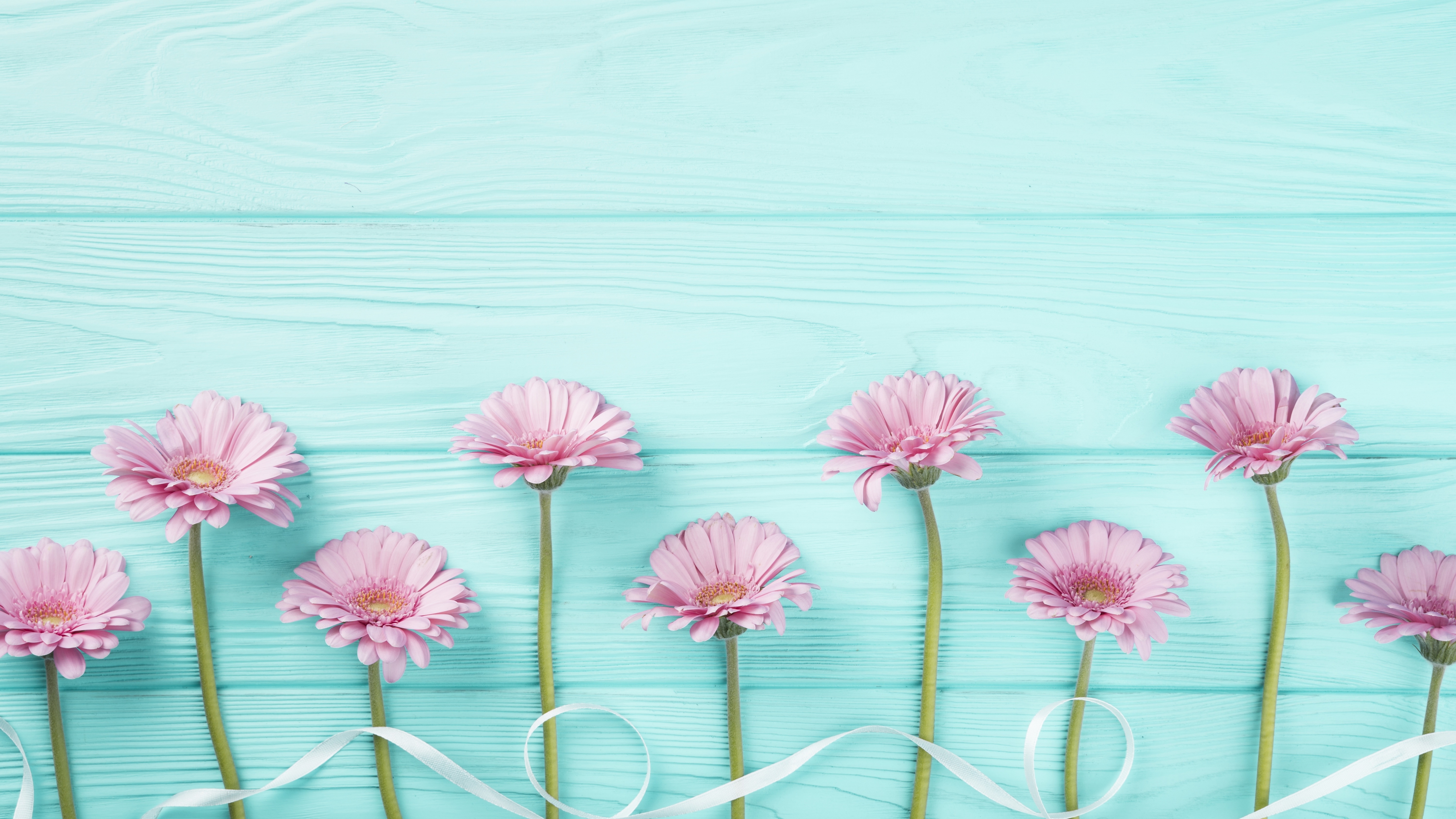 Description: A bunch of pink flowers with a white ribbon on a blue background with a white ribbon in the middle.