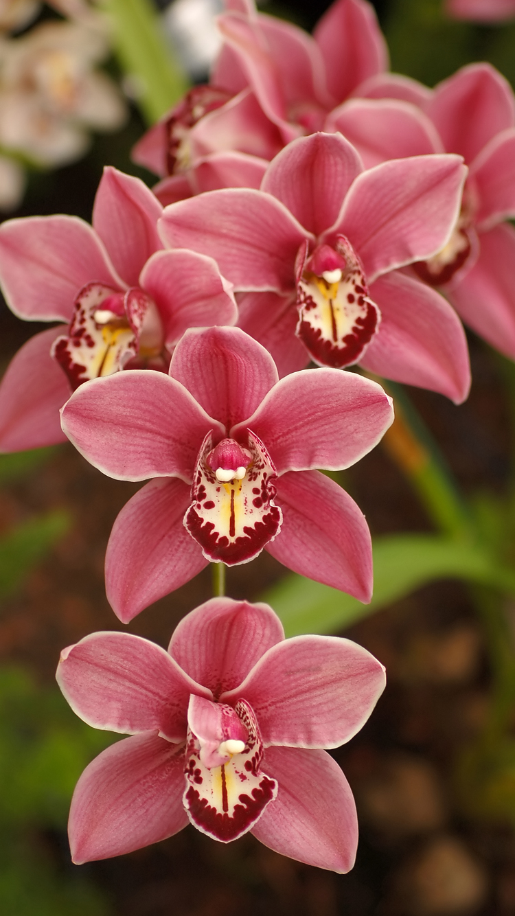 Description: A close up of a pink flower with white and red stripes on it's petals and a green background.