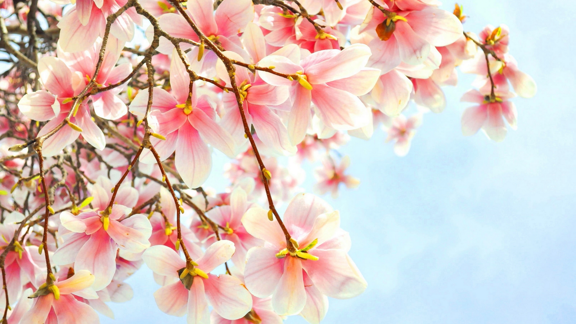 Description: A tree with pink flowers in the foreground and a blue sky in the background with a few clouds.