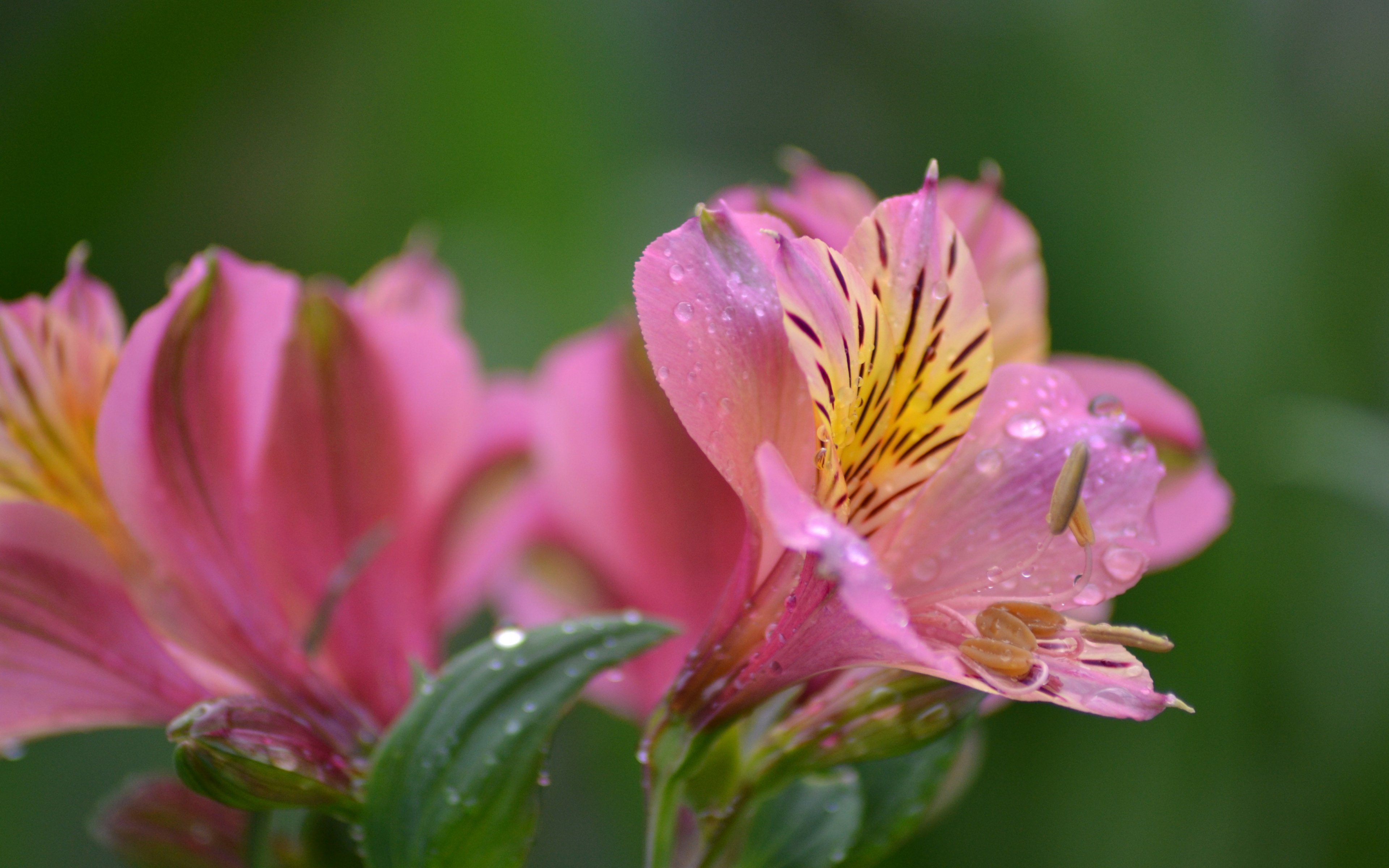 Description: A close up of a pink flower with water droplets on it's petals and green leaves in the background.