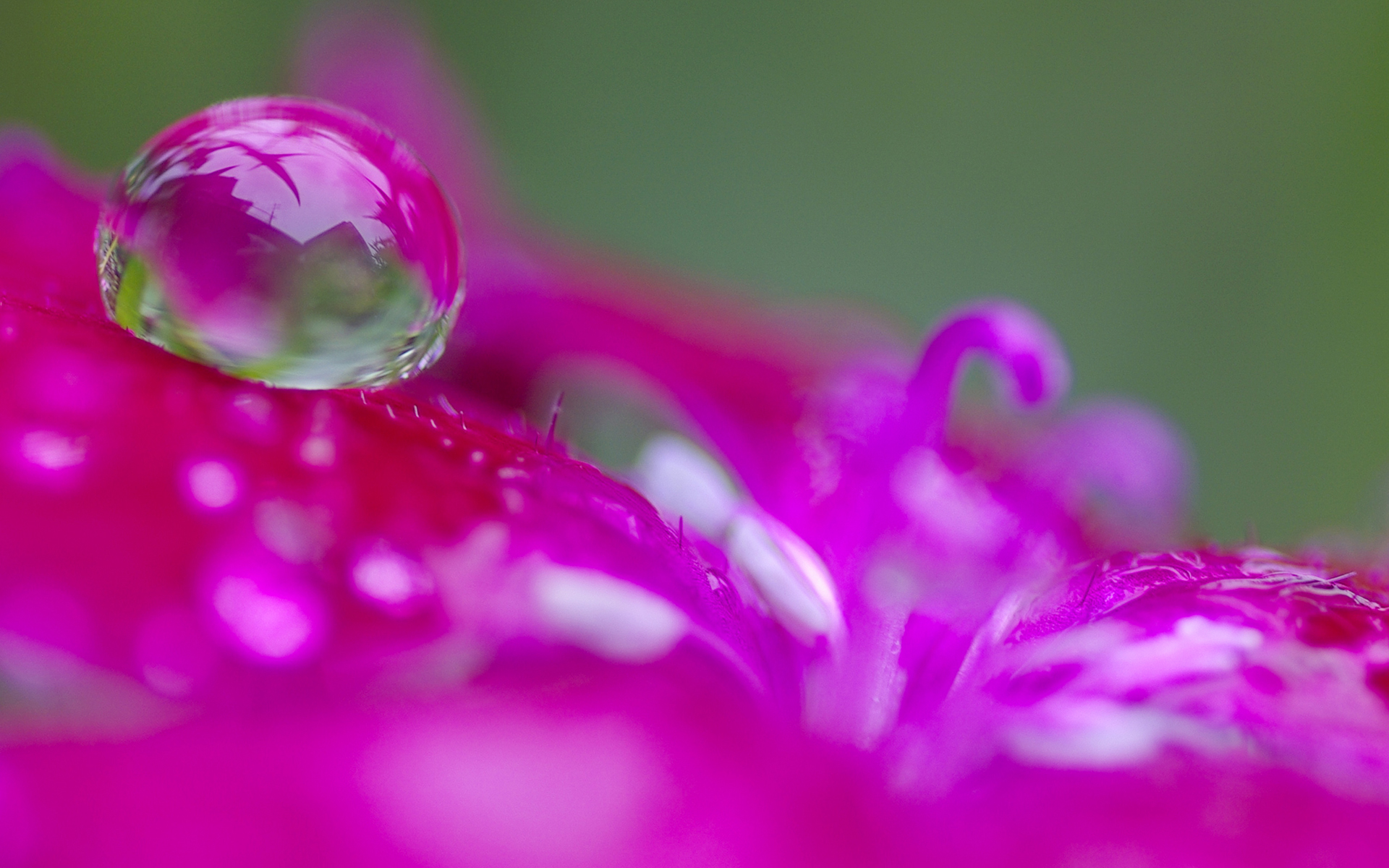 Description: A close up of a pink flower with a drop of water on it's center and a green background.
