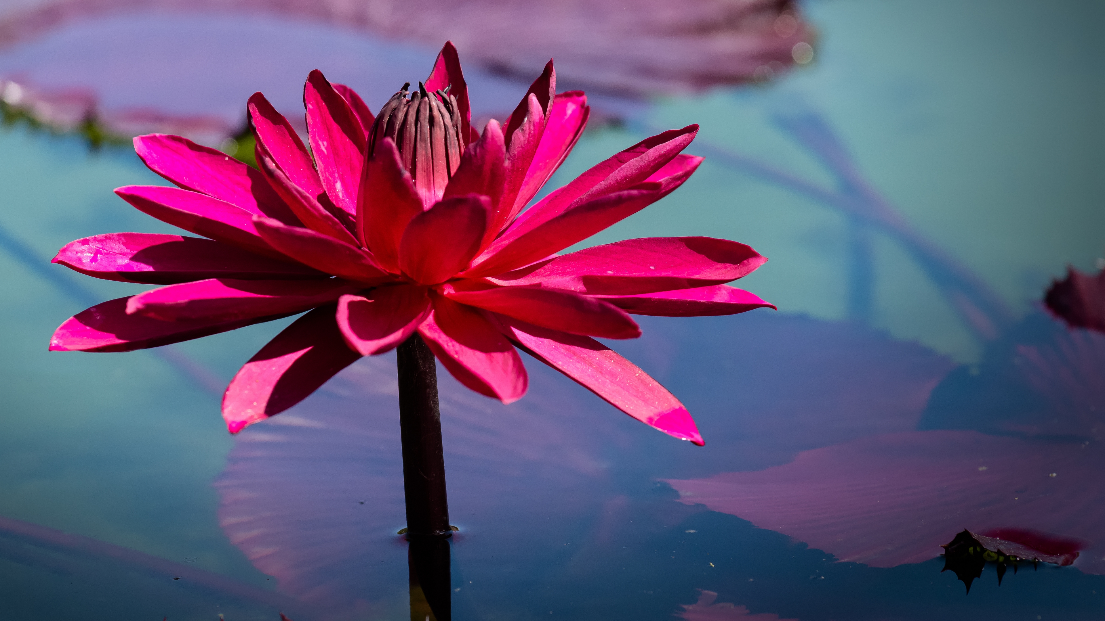 Description: A pink flower is in the water with lily pads on the surface of the water and a purple background.