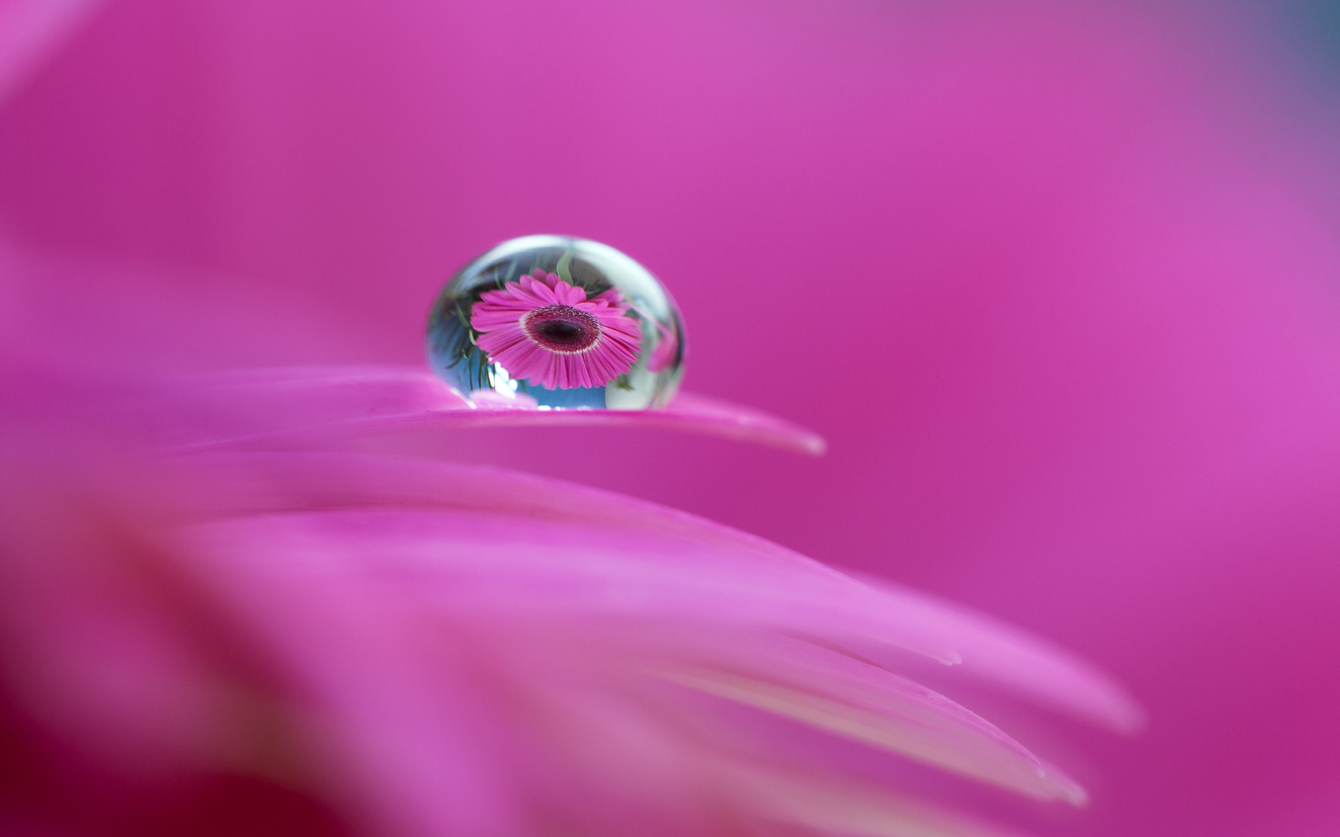 Description: A pink flower with a water drop on it's center and a blue background with a pink flower.