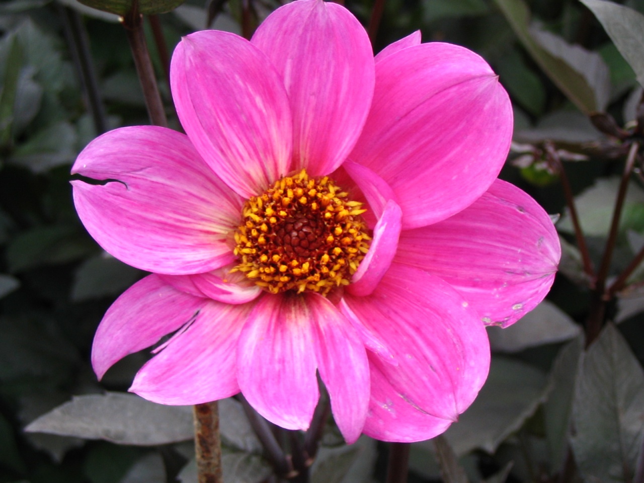 Description: A pink flower with yellow center surrounded by green leaves and foliages in the background.
