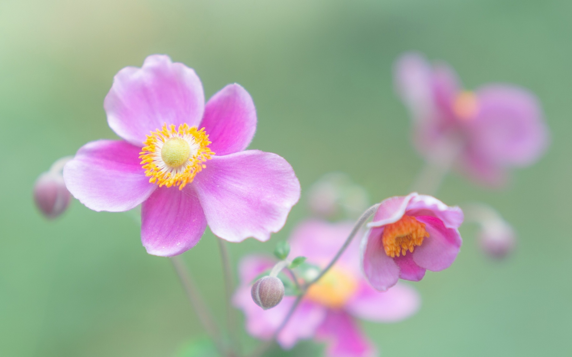 Description: A close up of a pink flower with a yellow center and a green background with blurry leaves and flowers.