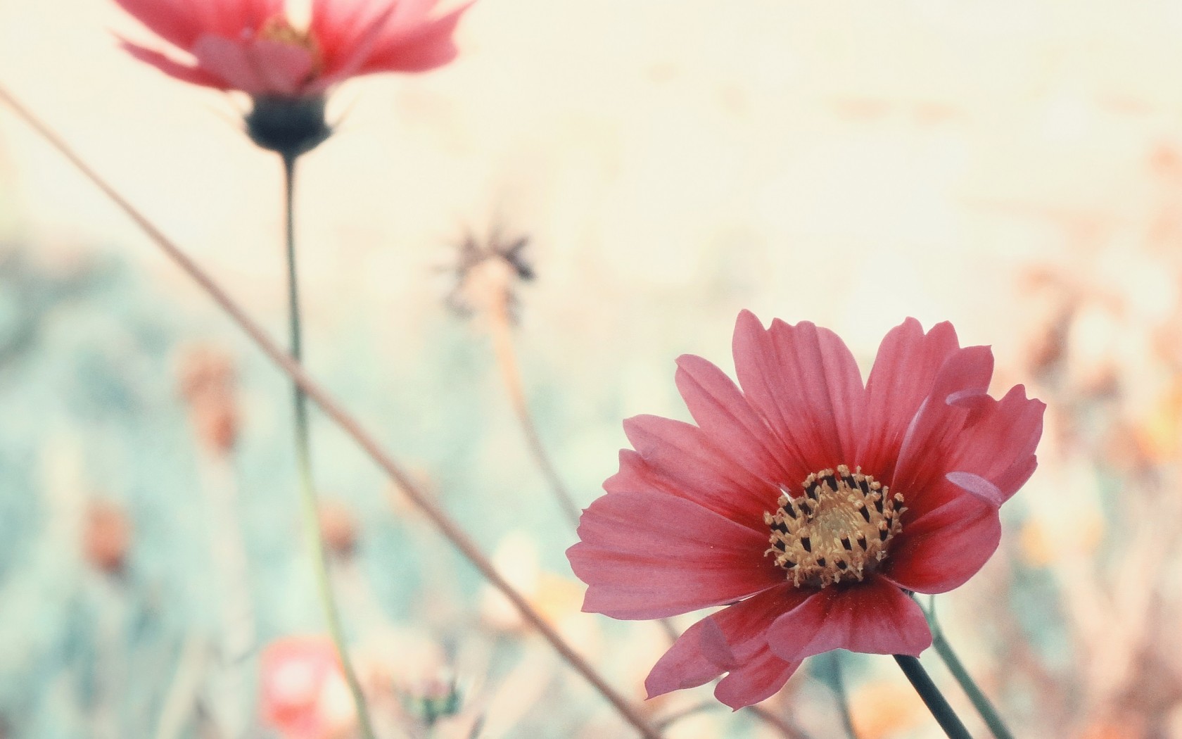 Description: Two pink flowers with a blurry background of grass and flowers in the foreground.