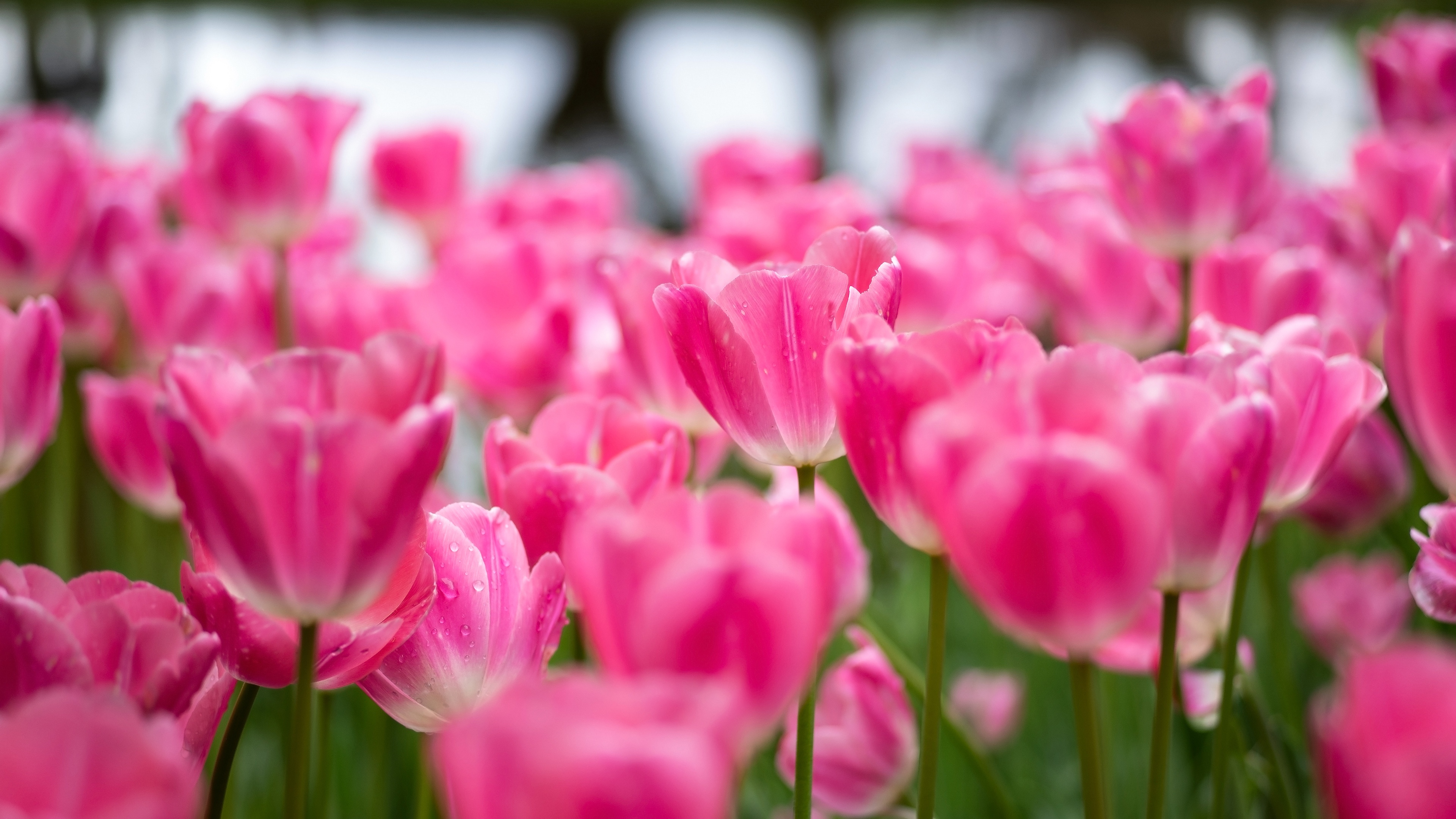Description: A field of pink flowers with a blurry background of trees in the background and a sky in the background.