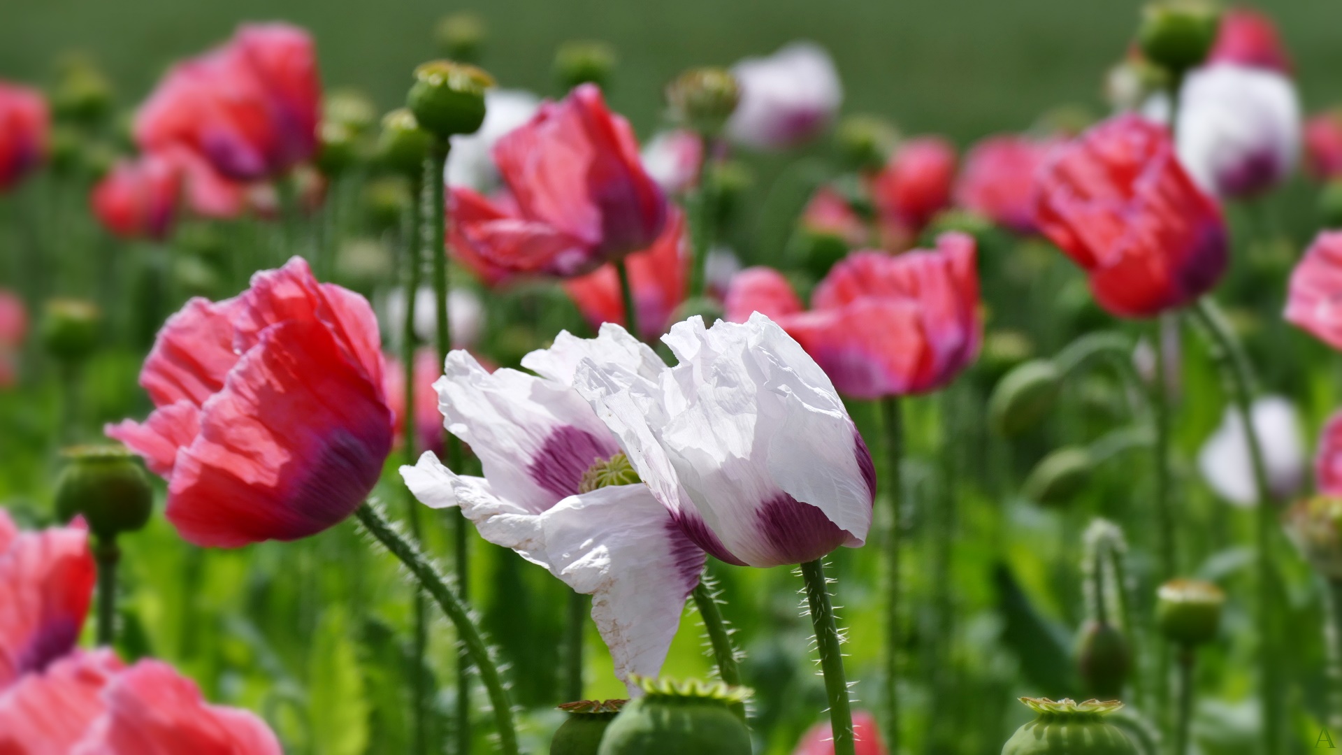 Description: A field of pink and white flowers with green stems and leaves in the background.