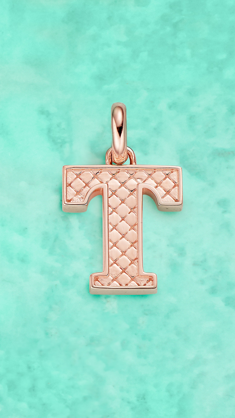 Description: A pink gold charm with a letter t on it on a turquoise background with a tiny diamond in the middle.