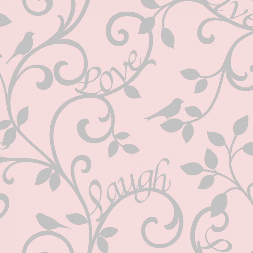 Description: A pink and gray wallpaper with a pattern of leaves and words on it that say love laugh laugh.