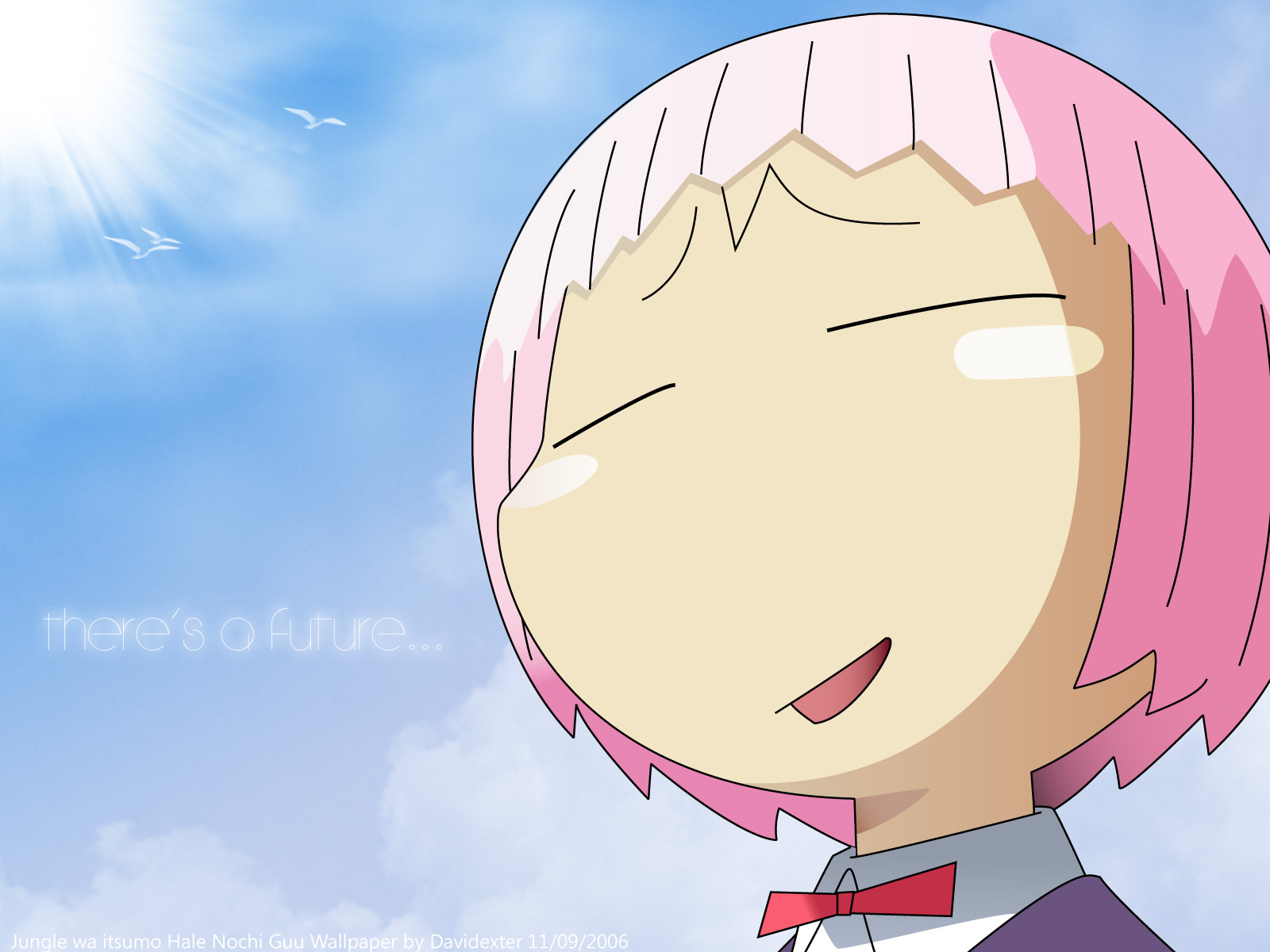 Description: A cartoon character with pink hair and a bow tie on a sunny day with a blue sky and clouds.