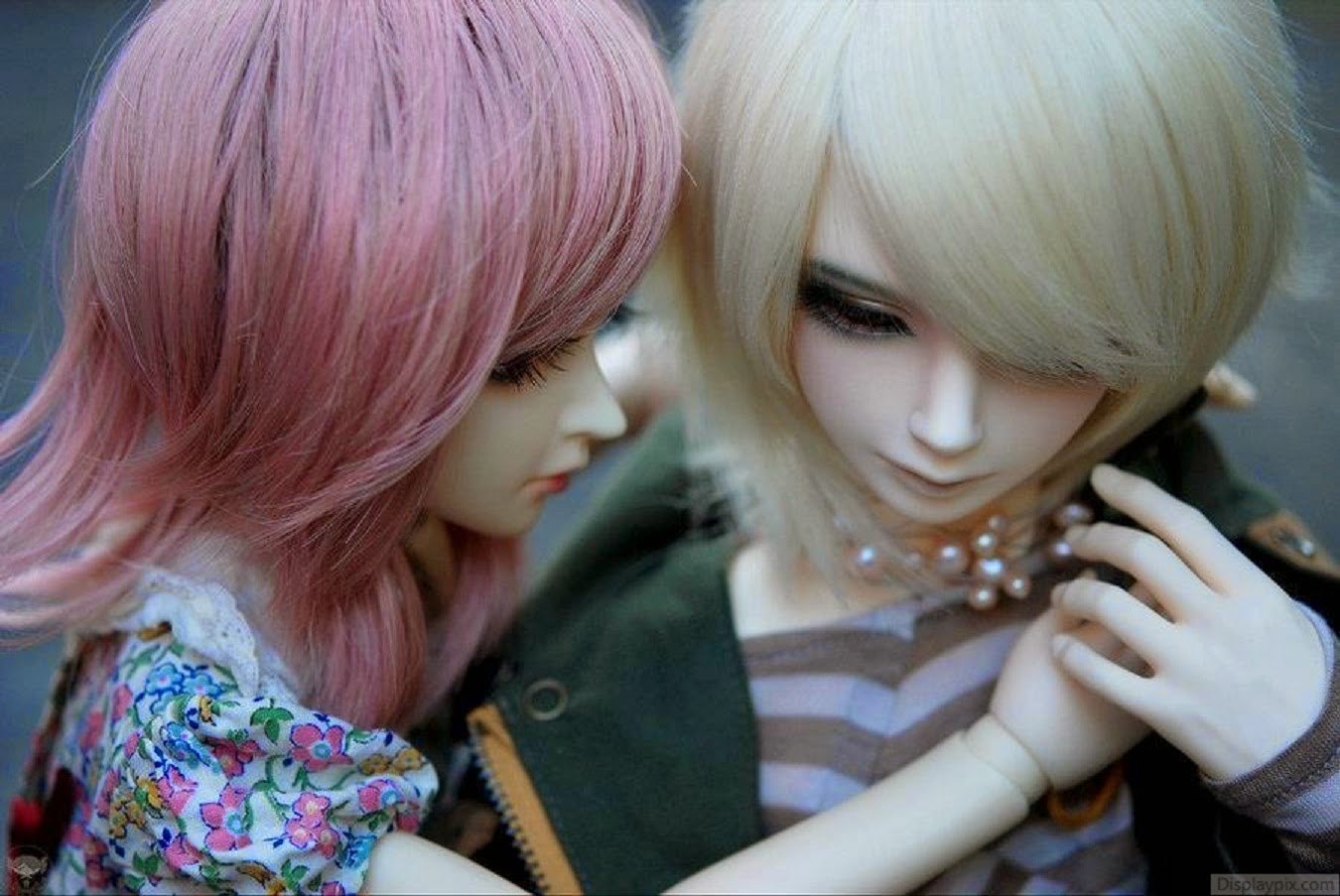 Description: Two dolls are standing next to each other with pink hair and bangs on their heads and hands together.