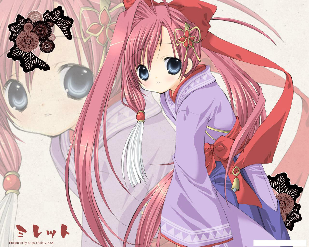 Description: A girl with pink hair and a pink dress with a bow on her head and a pink ribbon around her neck.