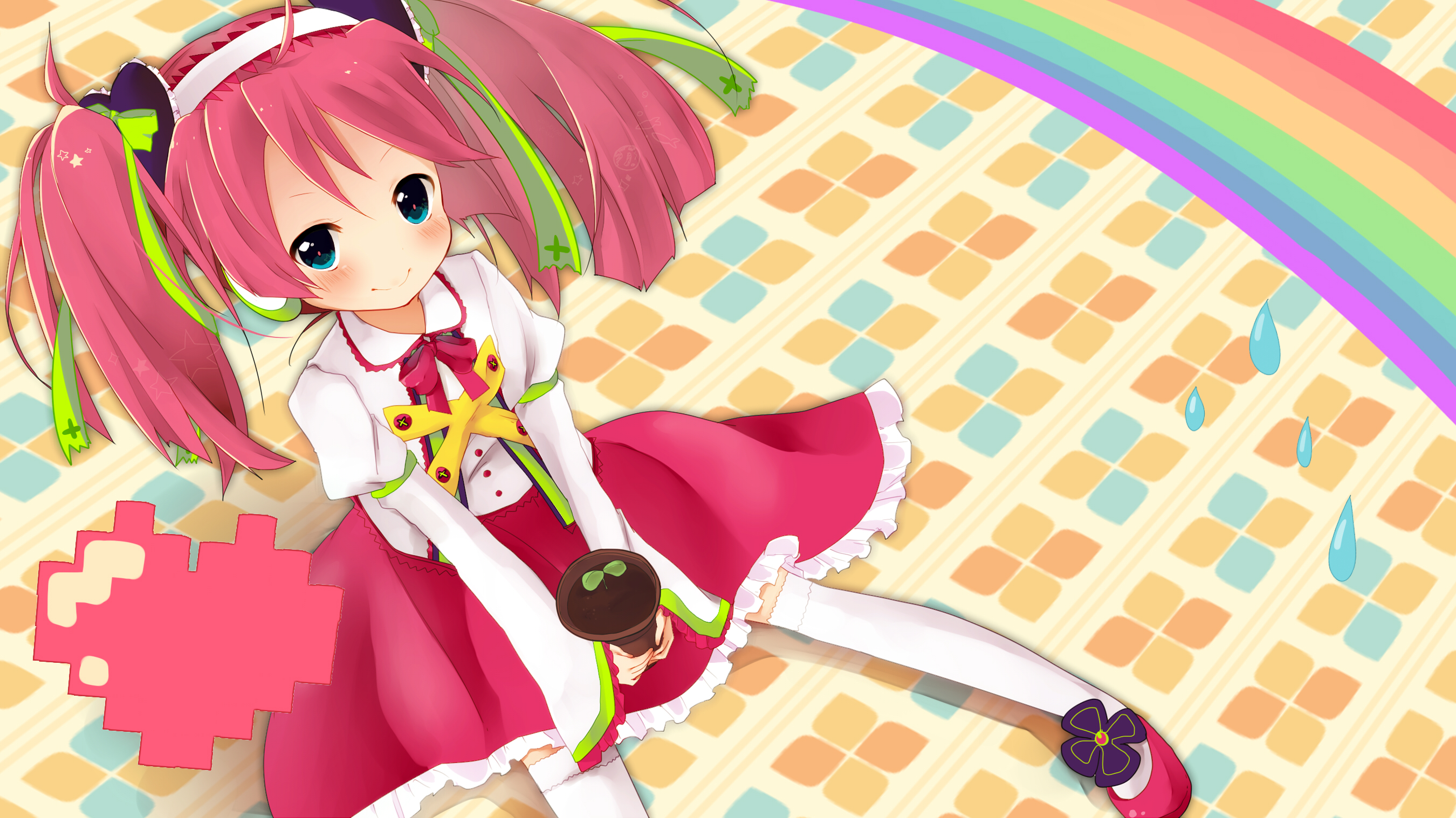 Description: A girl with pink hair and a pink dress is sitting on a floor with a rainbow in the background.