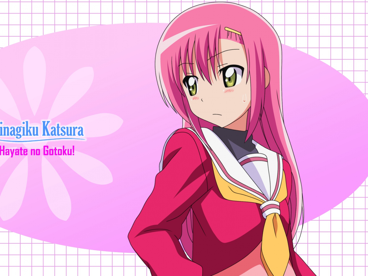 Description: A girl with pink hair and a pink dress with a yellow tie on her neck and a pink background.