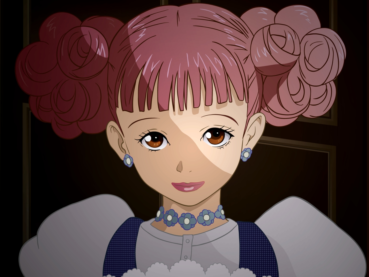 Description: A cartoon of a woman with pink hair and a dress with a flower in her hair and a necklace.