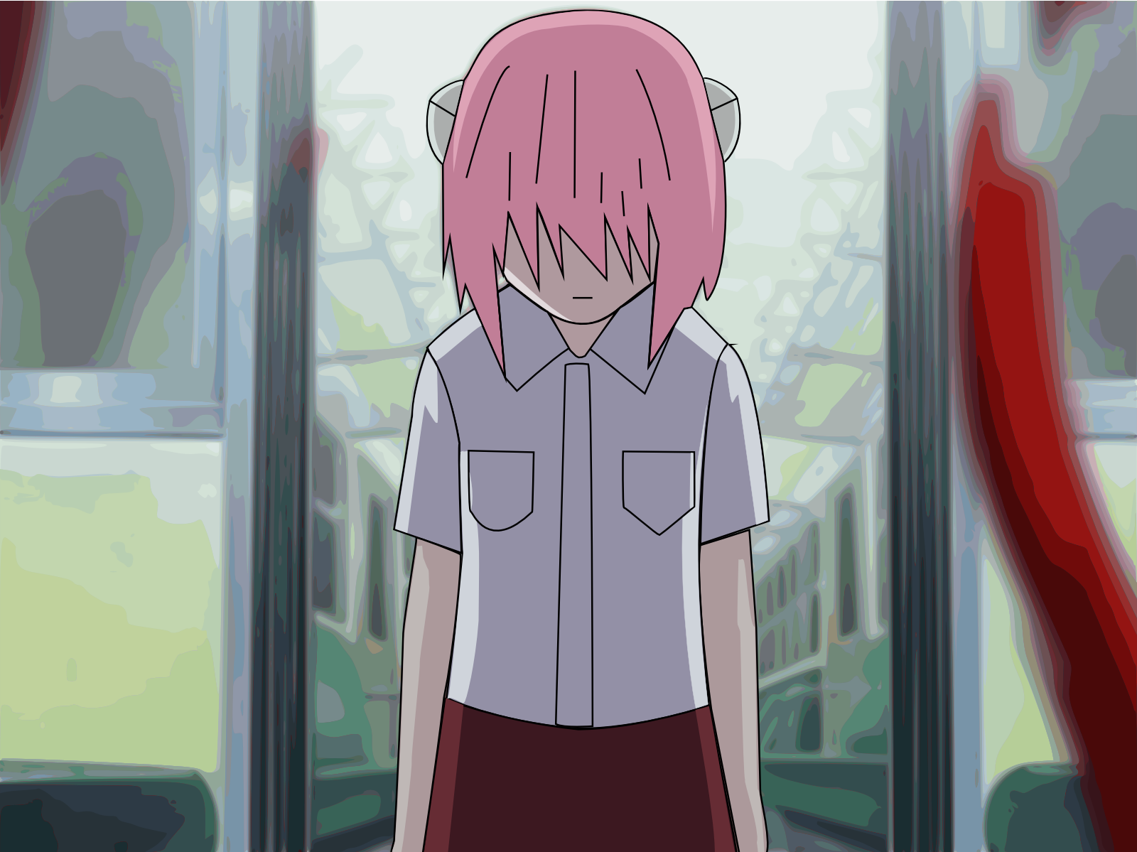 Description: A person with pink hair and a shirt on standing in a room with a red curtain and a red chair.