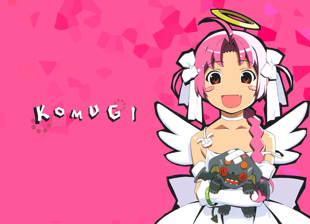 Description: A girl with pink hair and angel wings holding a stuffed animal in her arms and a pink background with a konogi on it.